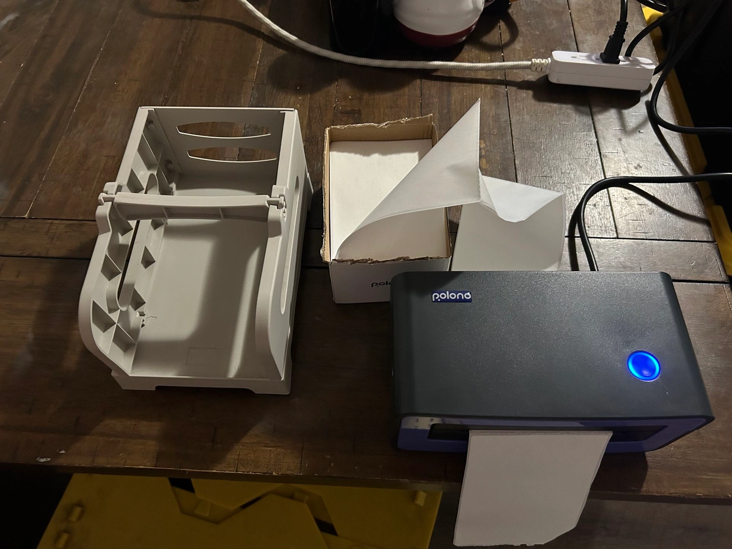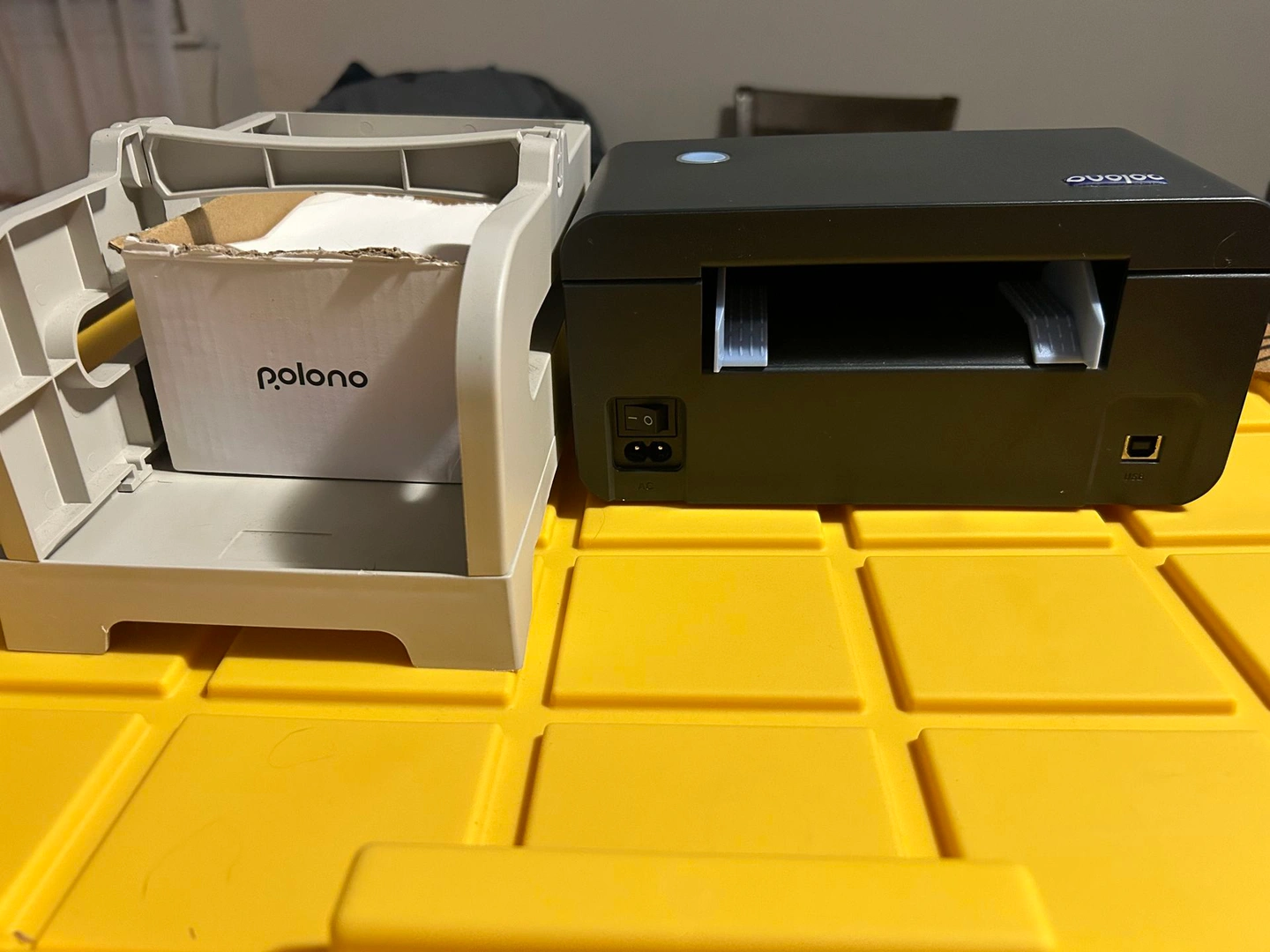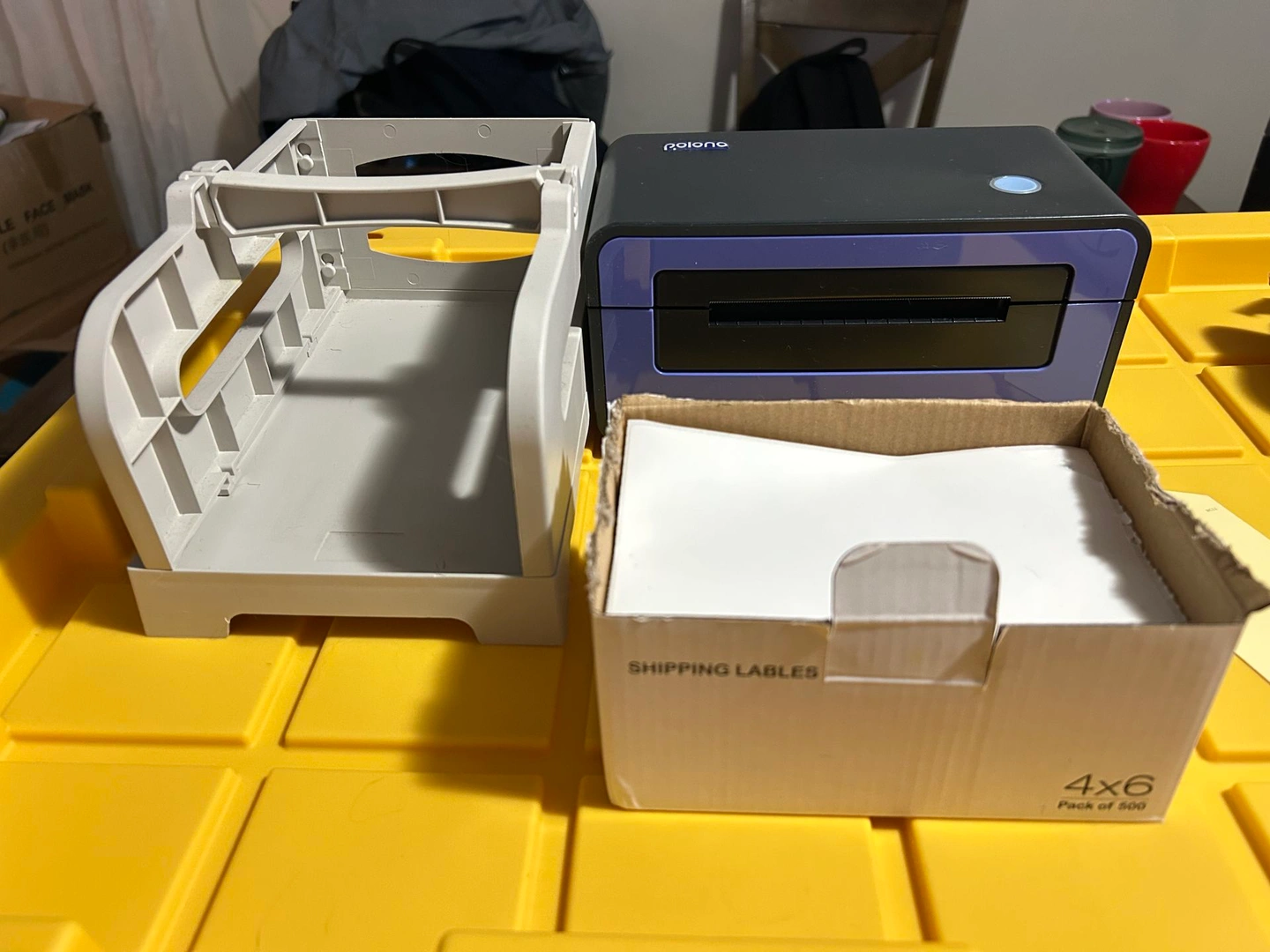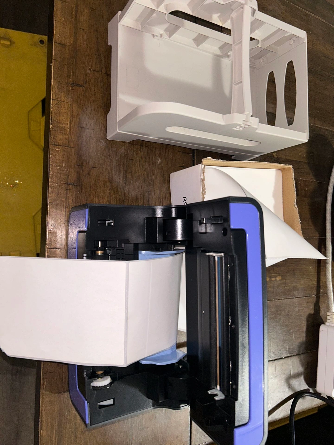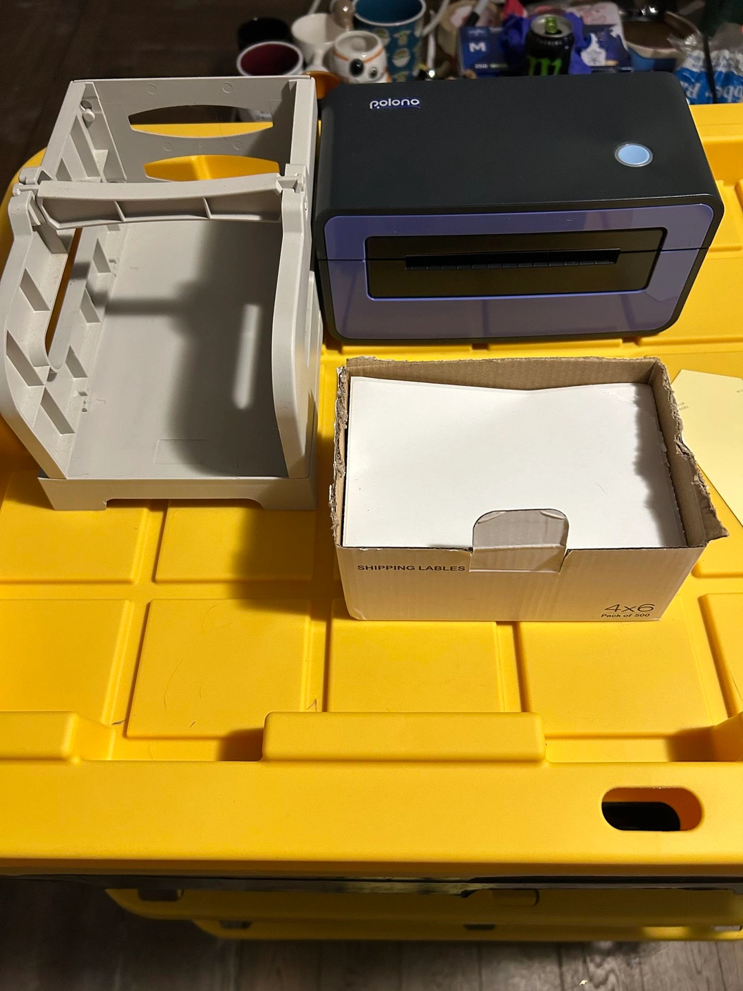 Slightly used but not needed anymore. Missing connector cable (usb connector for devices), easy buy at Best Buy! Comes with: Label Machine, 400 4x6 labels, Label Holder, Power Cord.