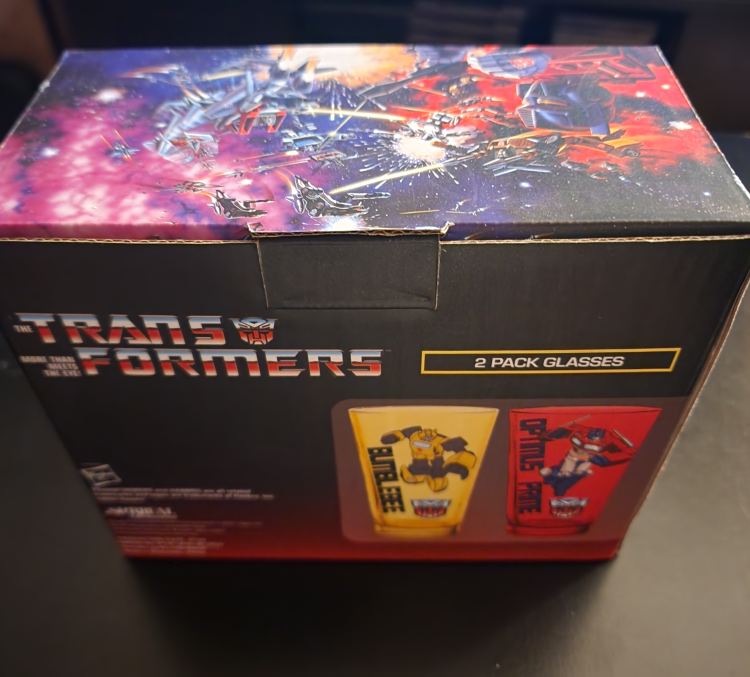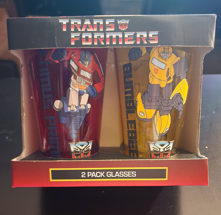 Selling a set of Transformers glasses featuring Bumblebee and Optimus Prime! This is a 2-pack set and comes in the original box