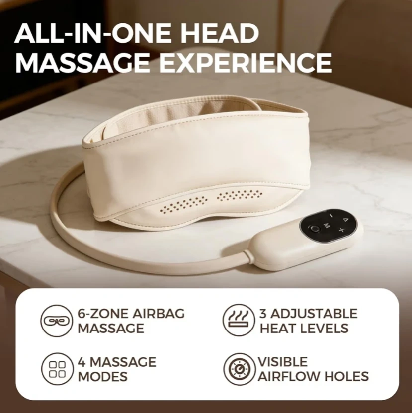 This eye and head massager offers a relaxing experience with 6-zone airbag massage and 3 adjustable heat levels. It has 4 massage modes and visible airflow holes for comfort. This device is great for relaxation and improving sleep.