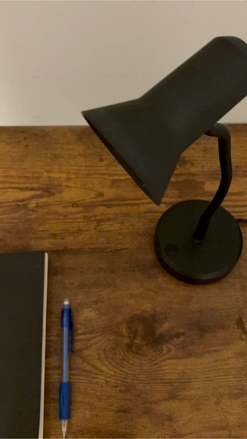 Matte black finish, a flexible/adjustable neck, and a very bright LED Desk Lamp.