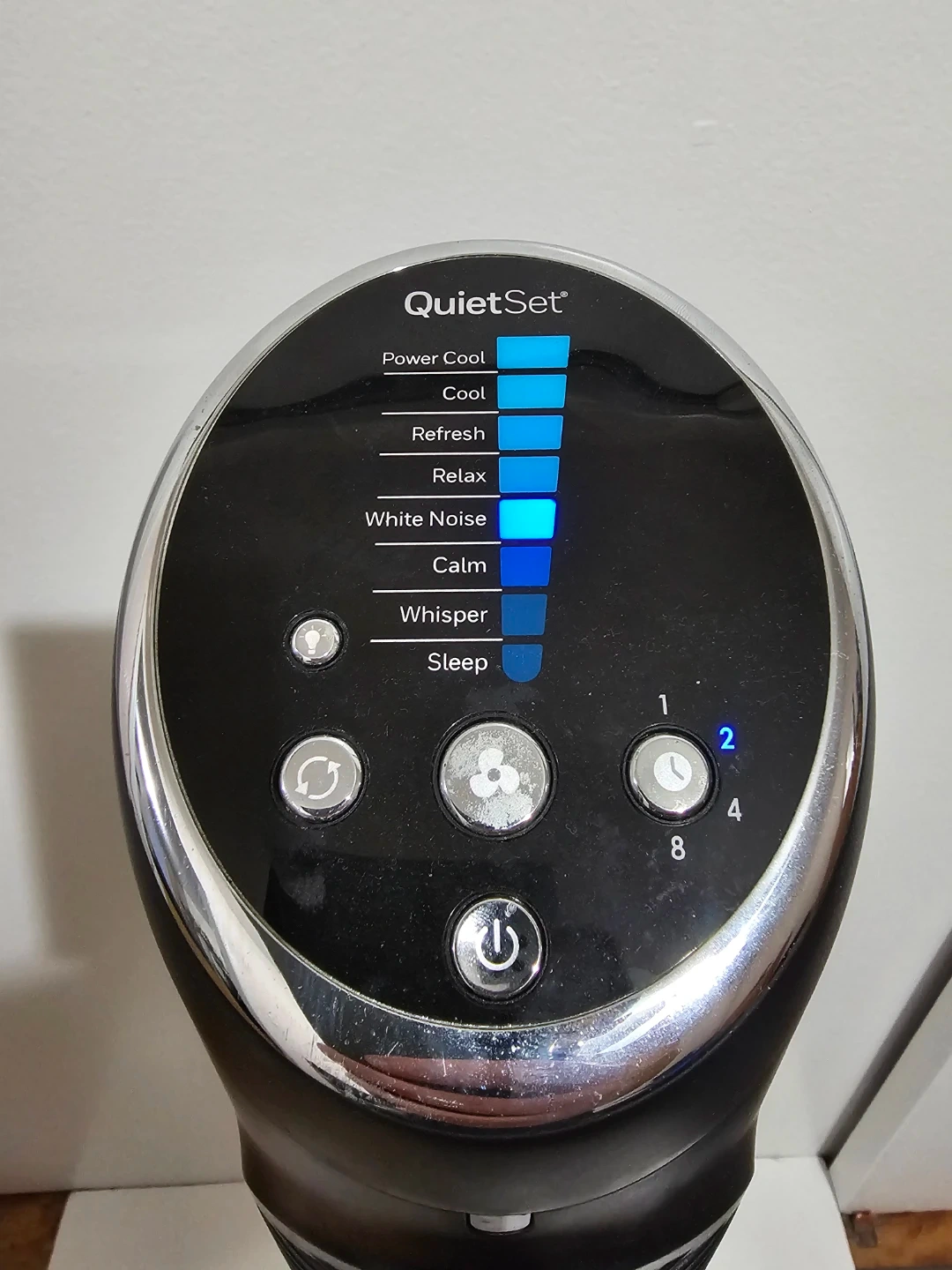 This Honeywell QuietSet tower fan offers multiple speed and comfort settings. It includes a remote control for convenience. The fan features various modes like Power Cool, Cool, Refresh, Relax, White Noise, Calm, Whisper, and Sleep.
