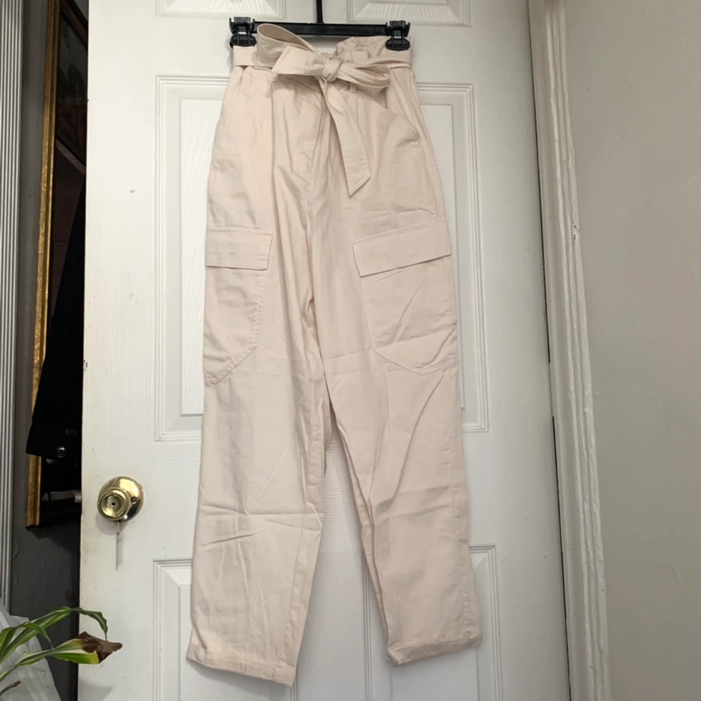 Brand new with tags - High waisted cargo pants with a tie belt and double latch. Two pockets on each side. Size 6.