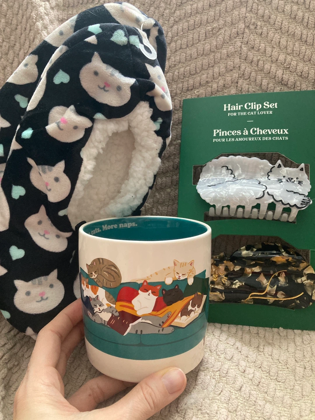 Price includes: - cat mug from Indigo - slipper socks - cat hair clips from Indigo All items are new and unused! Cash only, please. Meet in front of Lululemon store at 2558 Yonge Street, north of Eglinton at Briar Hill.