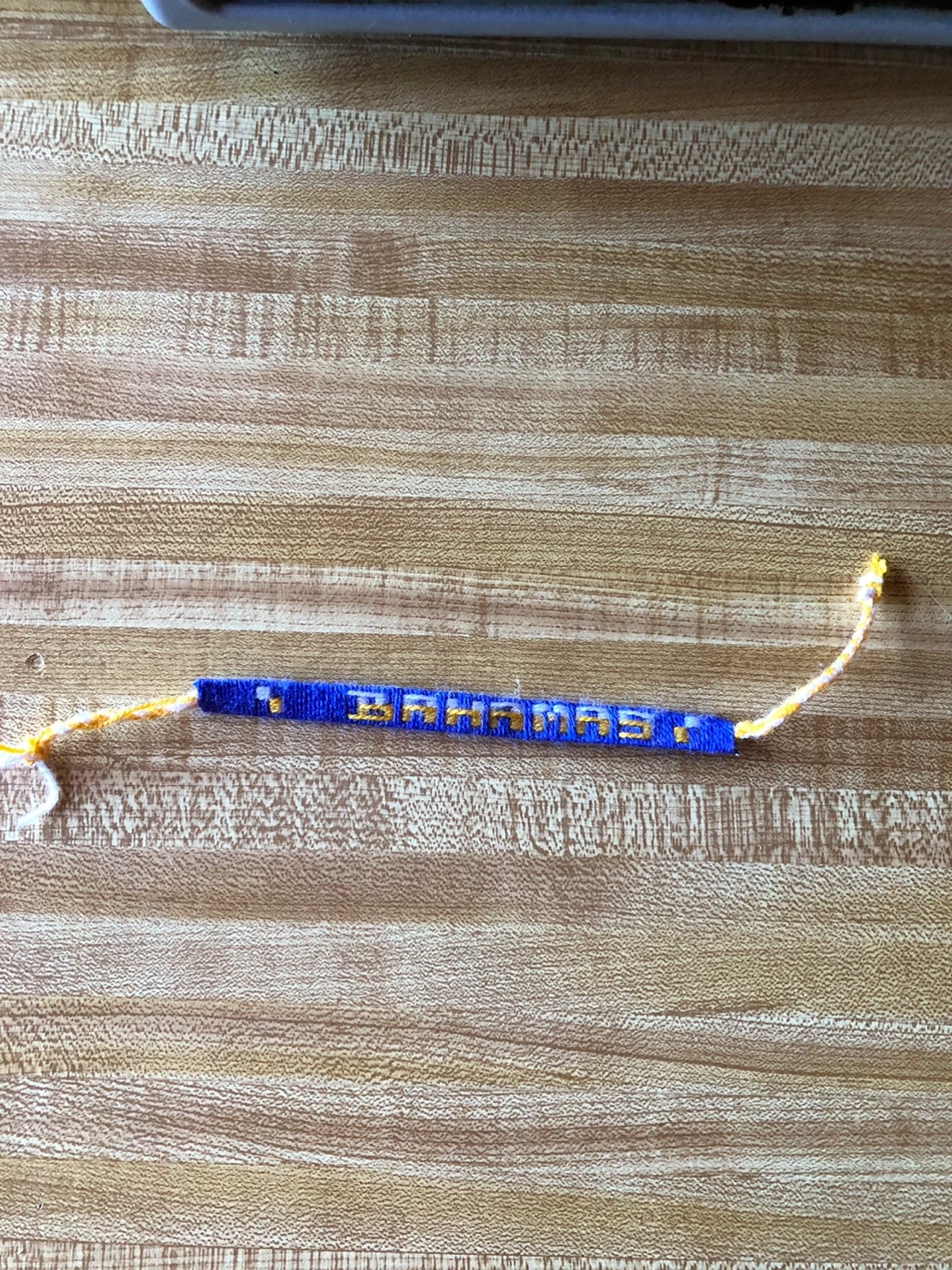 This is a handmade friendship bracelet with "Bahamas" woven into it. It's blue with gold lettering and has yellow strings for tying. It's a fun accessory for any fan of the Bahamas!