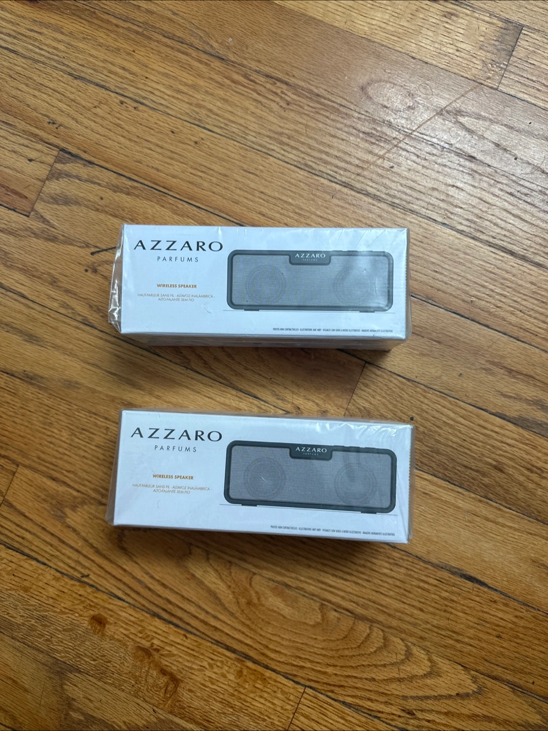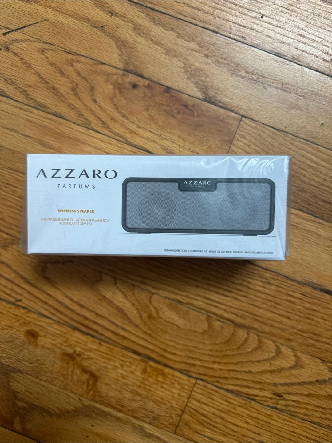 Brand new, unopened AZZARO Parfums wireless speaker. Compact design. Perfect for travel or home use.