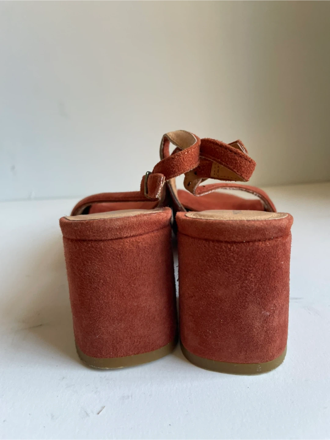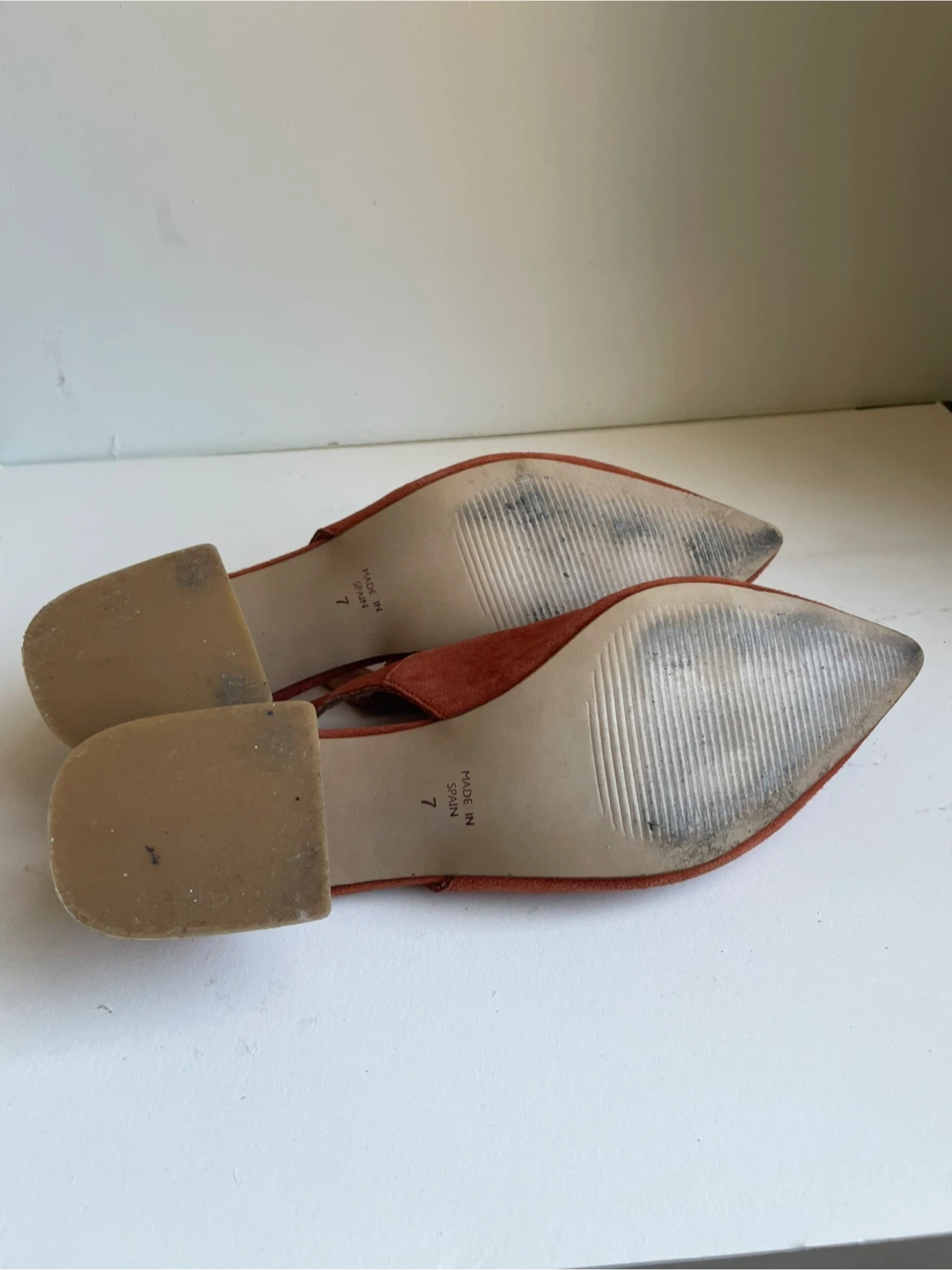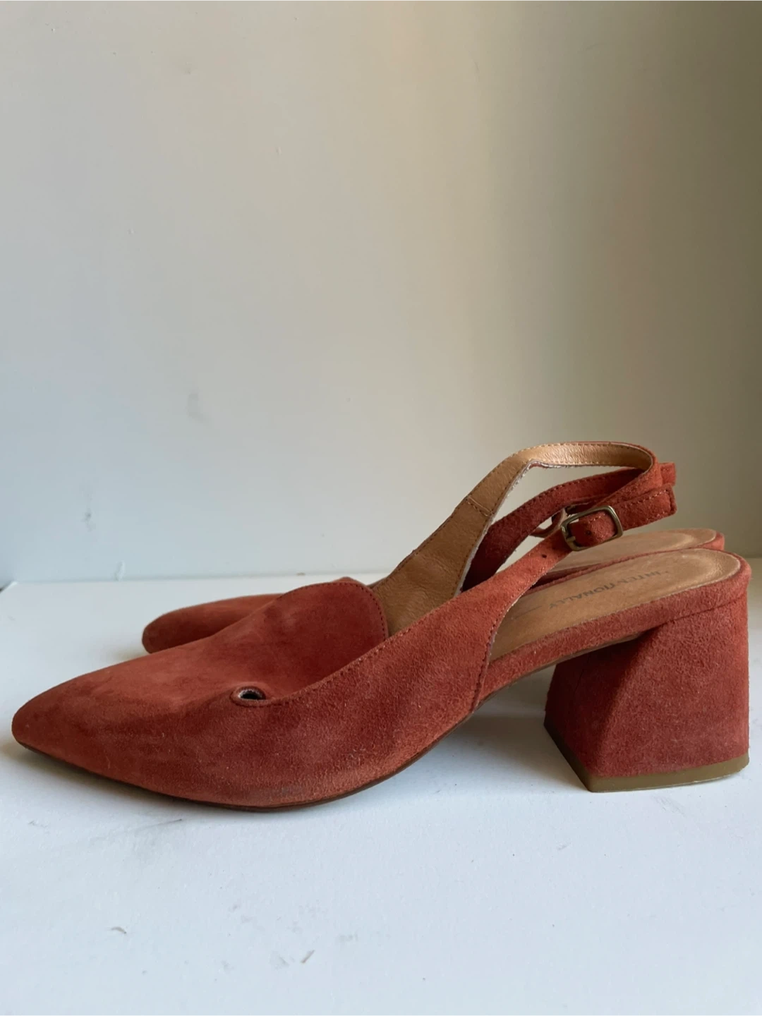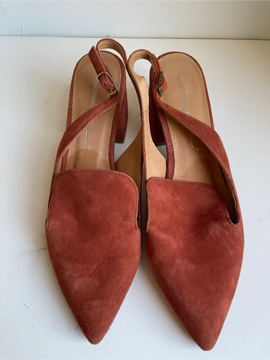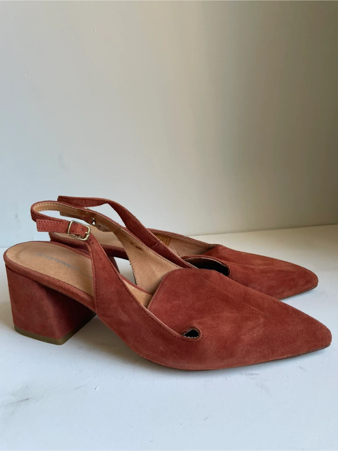 These are “Internationally ___”suede slingback heels in a reddish-brown color. They feature a pointed toe and a buckle closure on the strap. Made in Spain. Size 7.