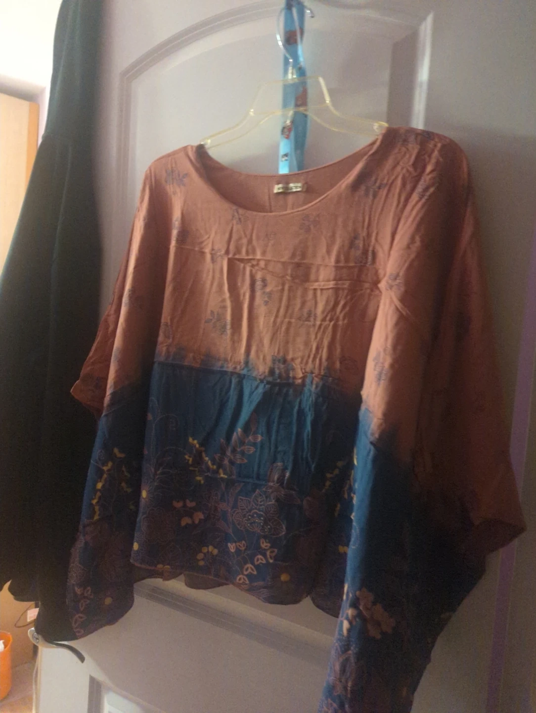 This is a women's tie-dye top with a floral print. It features a rounded neckline and loose-fitting sleeves. The bottom half has a dark teal tie-dye with embroidered floral patterns. The top half is a peach color with a subtle floral print. It's made of a lightweight fabric.