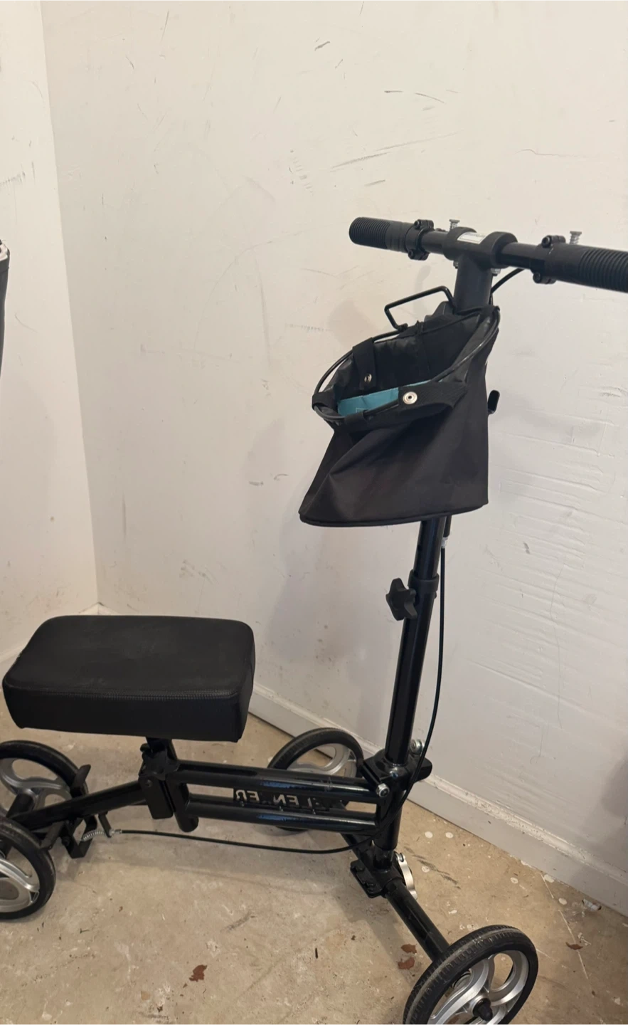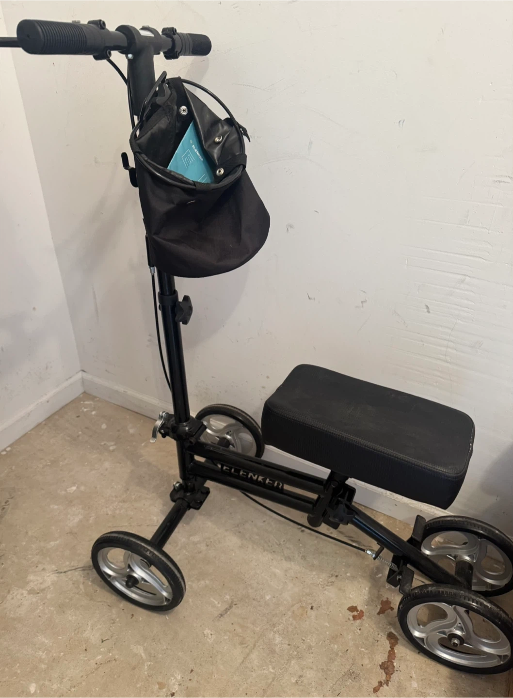 Black ELENKER knee scooter walker with adjustable handle height and a removable storage bag. It's designed for mobility assistance. This is useful for individuals recovering from leg or foot injuries.