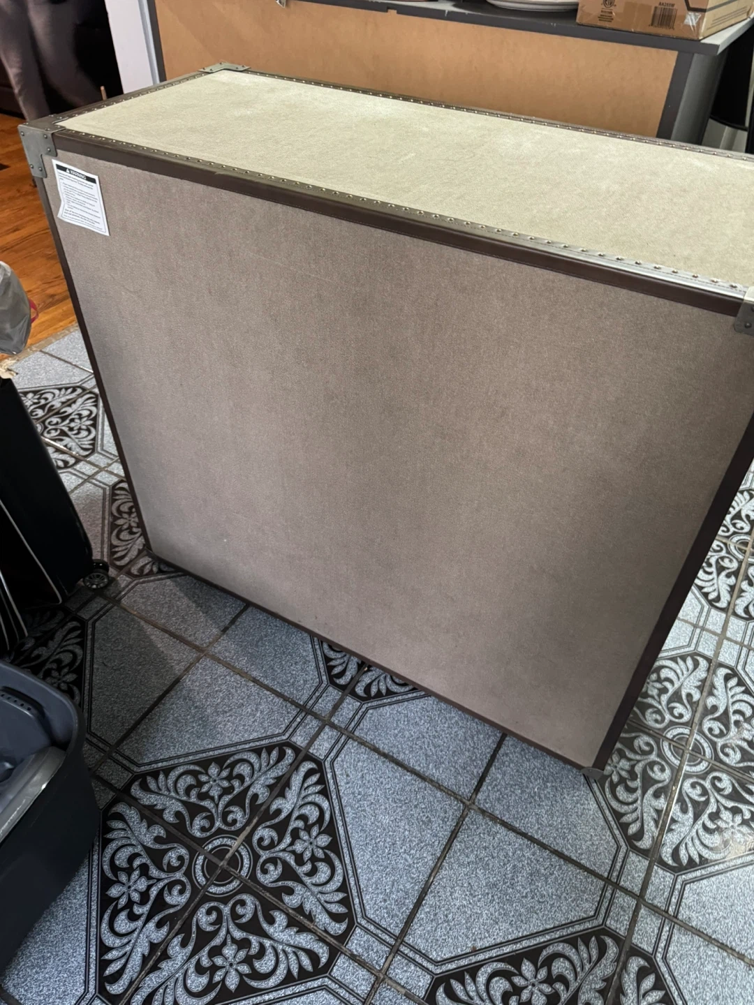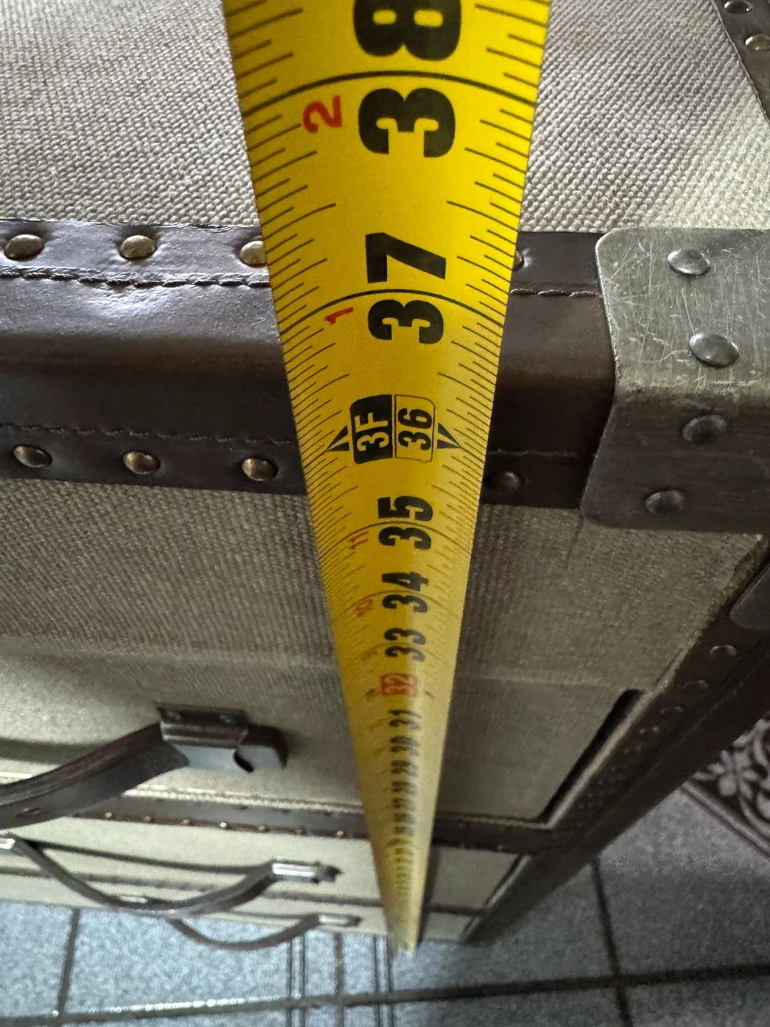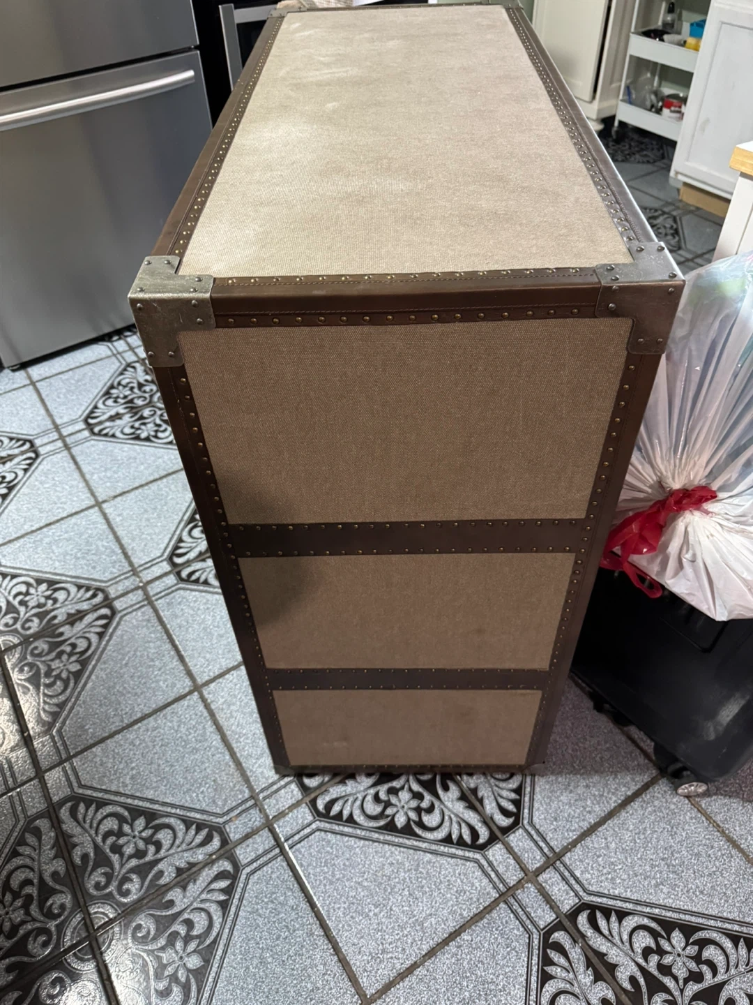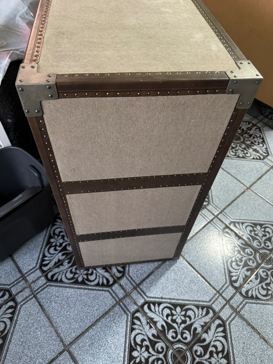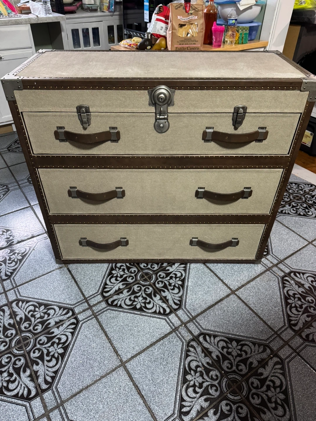 This storage chest features a vintage steamer trunk design with faux leather accents and metal hardware. It has three spacious drawers for organization. A great piece for storing linens, clothes, or other household items!