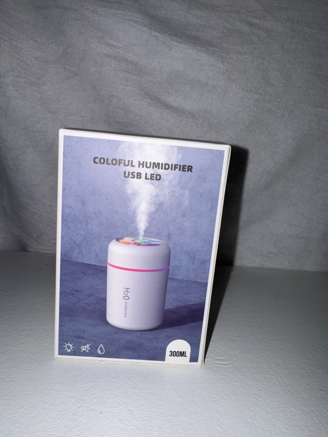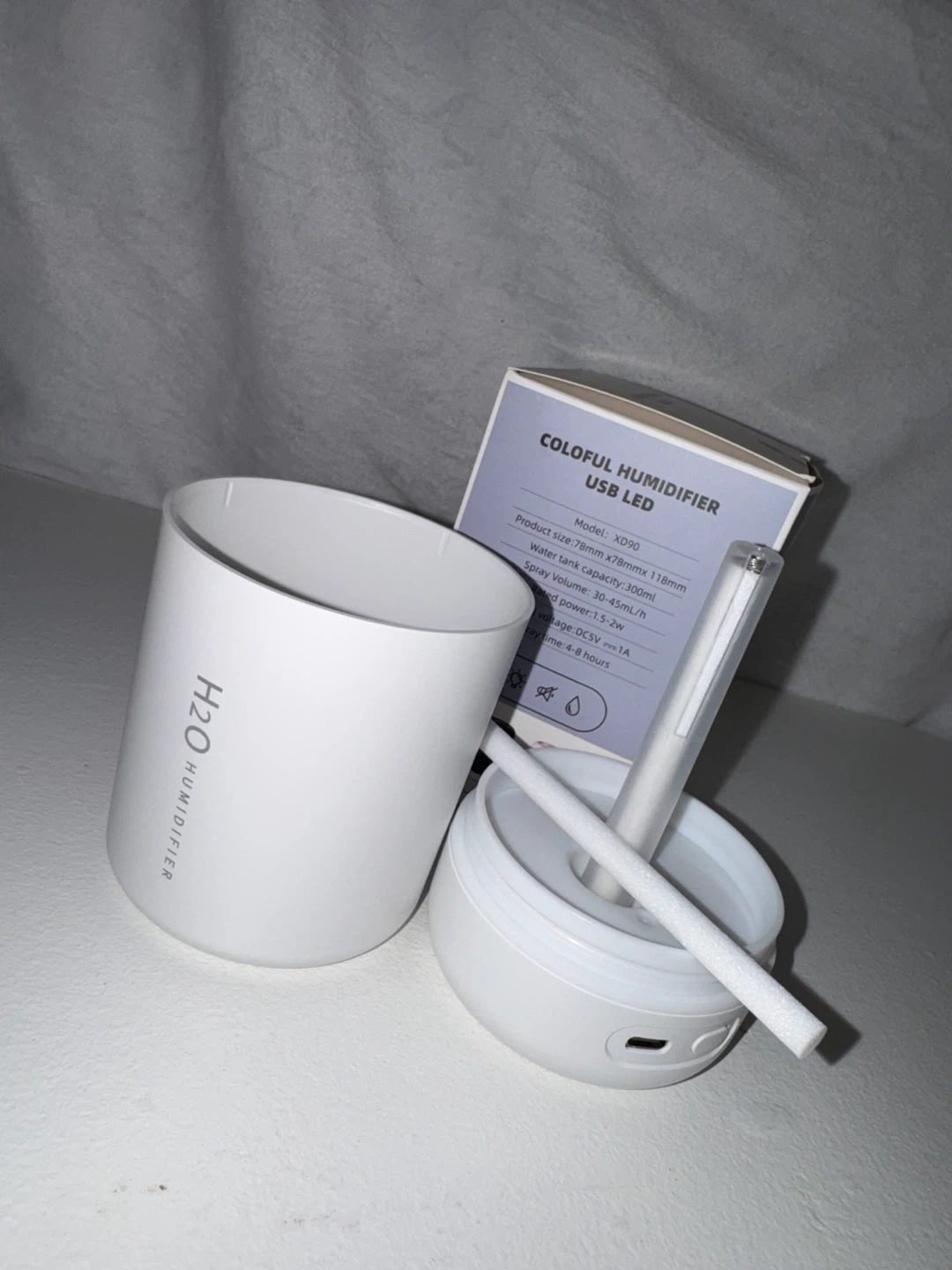This H2O Humidifier is a USB LED model with a 300ml water tank capacity. It offers a spray volume of 30-45ml/h and operates at a rated power of 1.5-2W. Rated voltage is DC5V, 1A, and it provides up to 4.8 hours of spray time. It's a portable and convenient way to add moisture to your space!