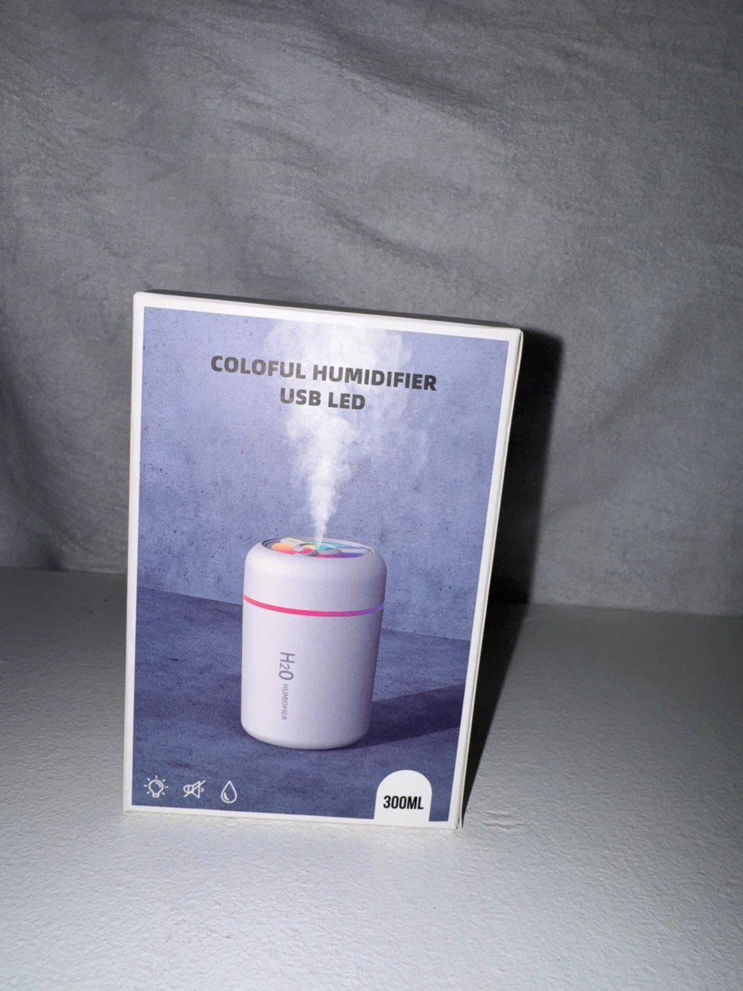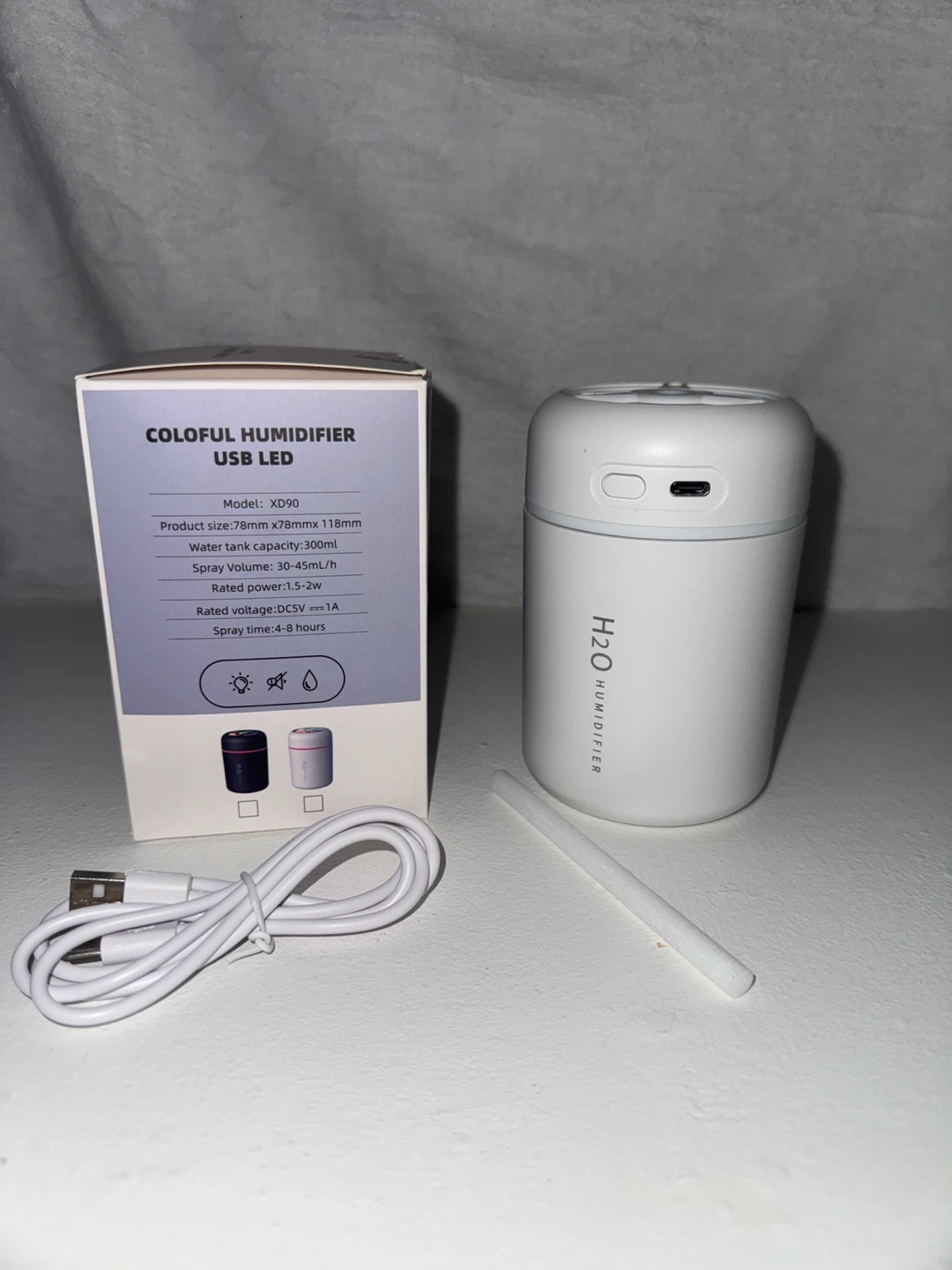 This H2O Humidifier is a USB LED model with a 300ml water tank capacity. It offers a spray volume of 30-45ml/h and operates at a rated power of 1.5-2W. Rated voltage is DC5V, 1A, and it provides up to 4.8 hours of spray time. It's a portable and convenient way to add moisture to your space!