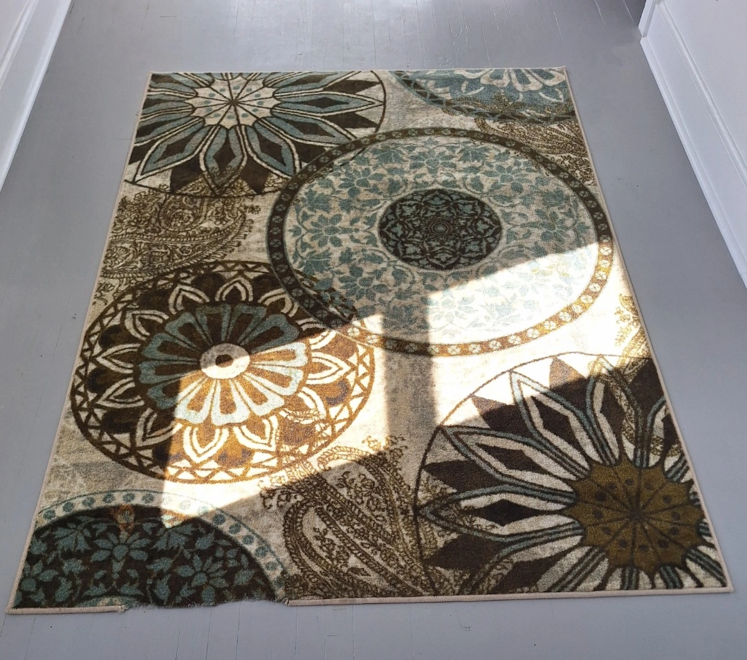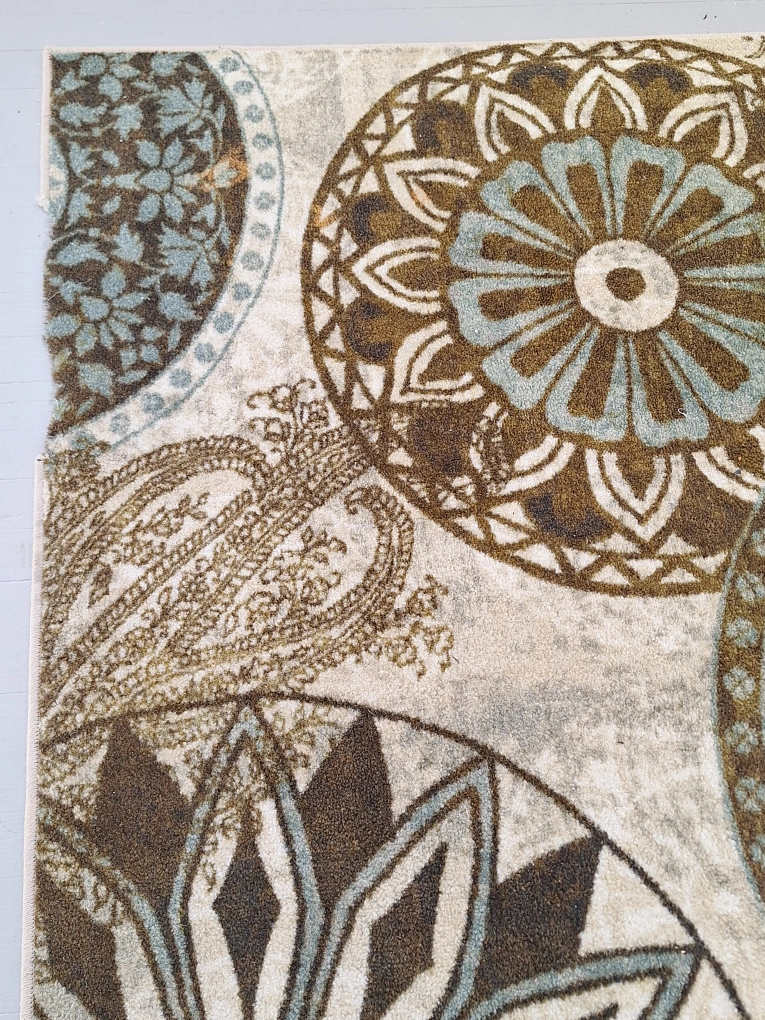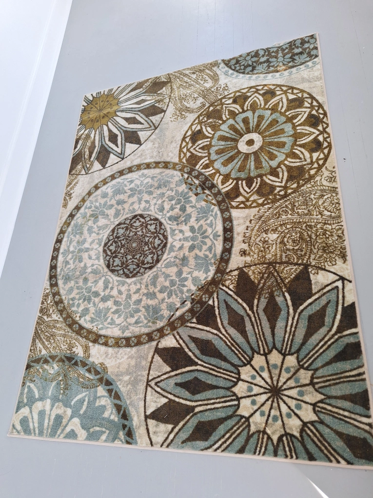 This area rug features a beautiful floral medallion pattern in shades of brown and blue. It would be a cozy addition to any room. There is a small snag on the one side that is not overly noticeable. Comes from a pet-free and smoke-free home.