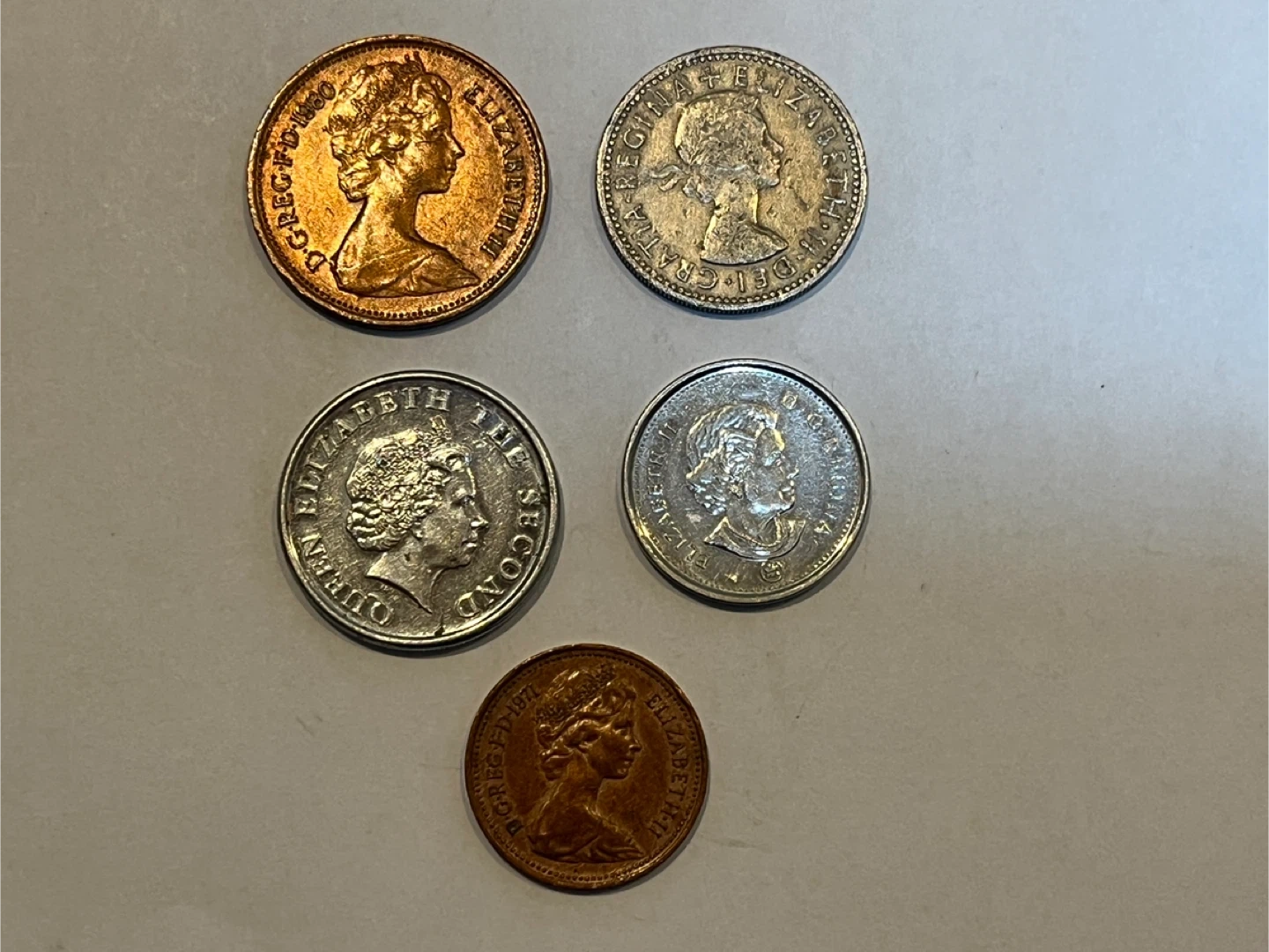 98- 1980 UK 2 New Pence - 1956 Great Britain 1 Shilling - 2017 Caribbean 25 Cents - 2011 Canadian 5 Cents - 1971 UK 1 New Penny