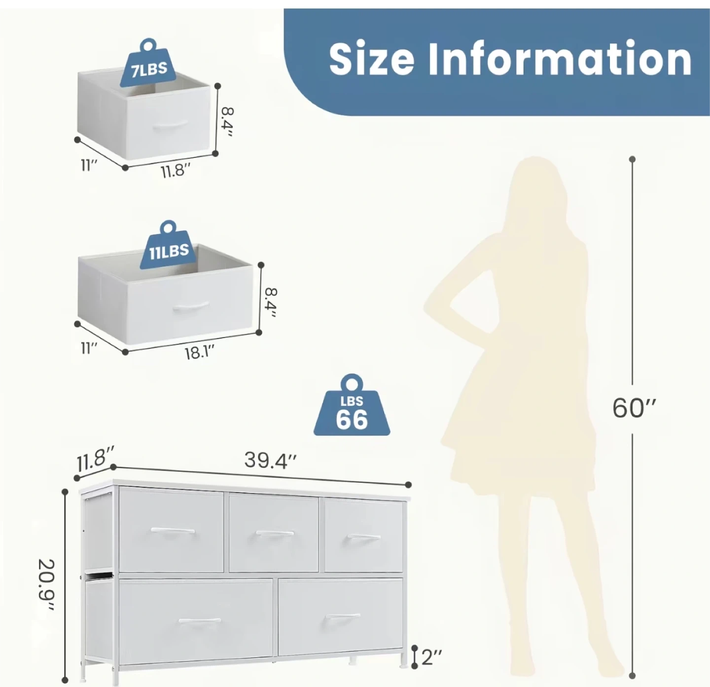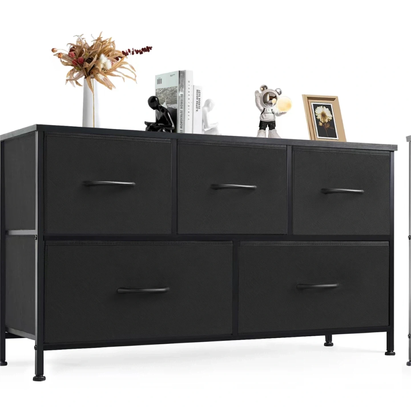 This is a 5-drawer dresser, perfect for adding storage to any room. It's black and has a sleek, modern look. The dimensions are approximately 39.4" wide, 11.8" deep, and 20.9" high. Each drawer can hold a good amount of clothing or other items