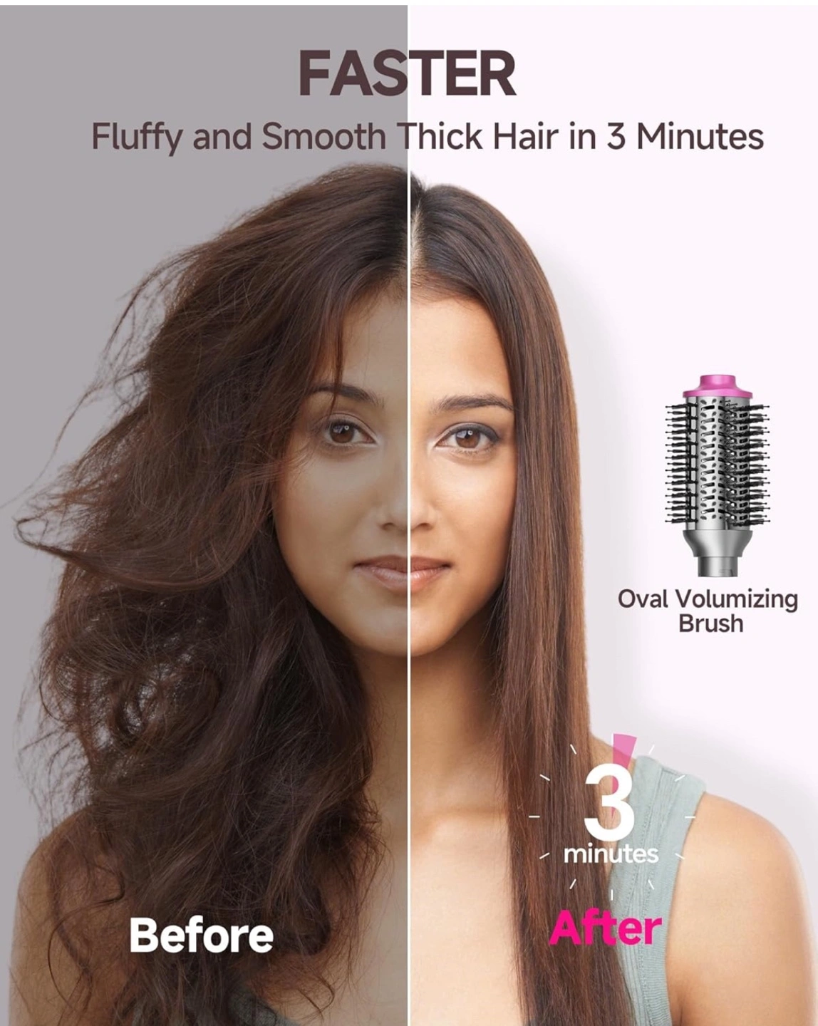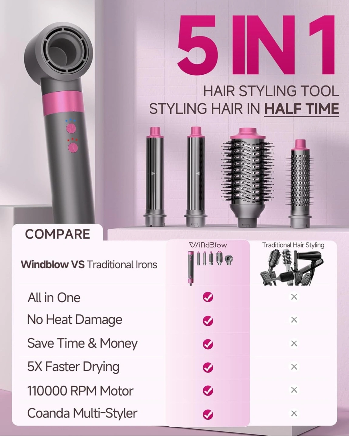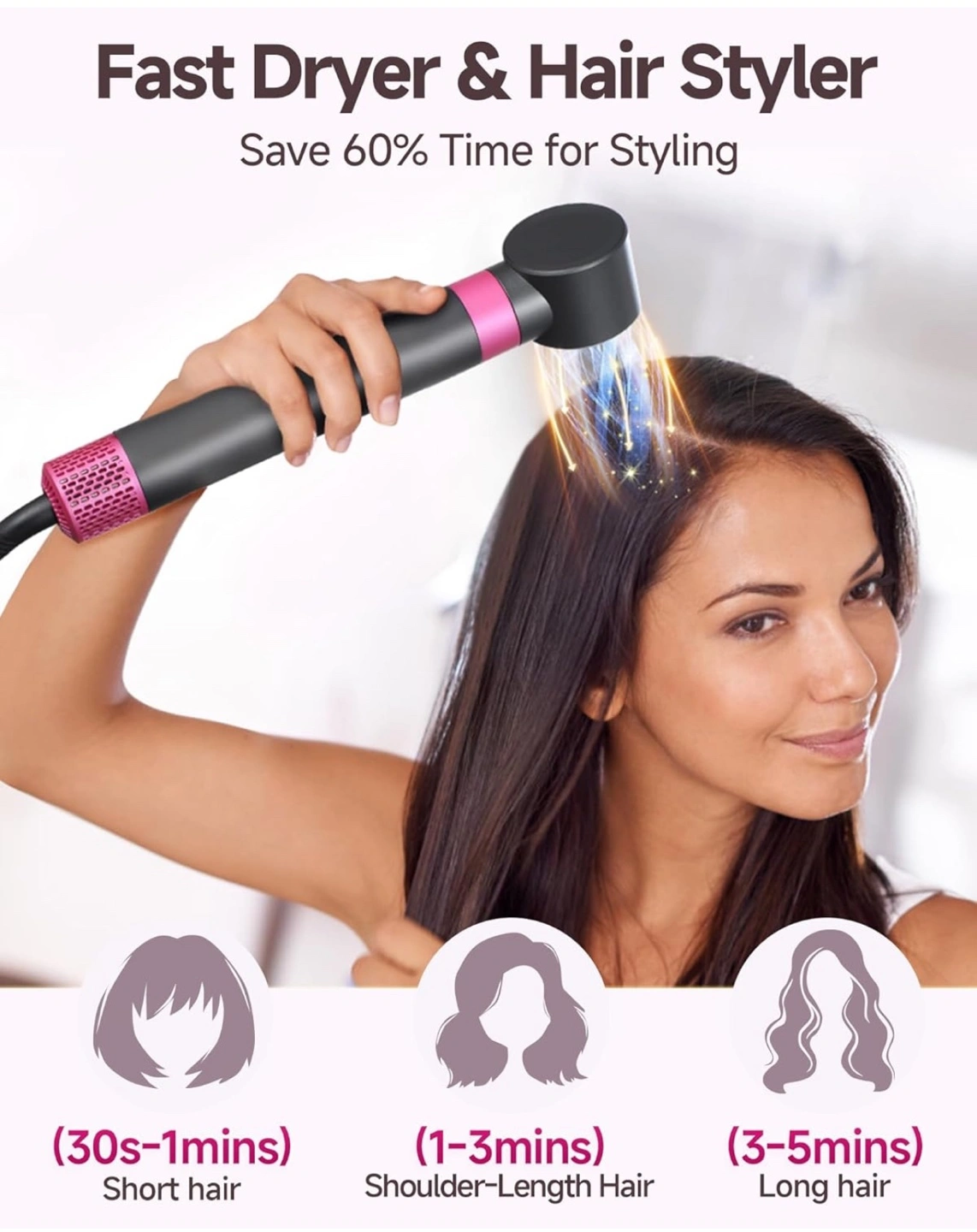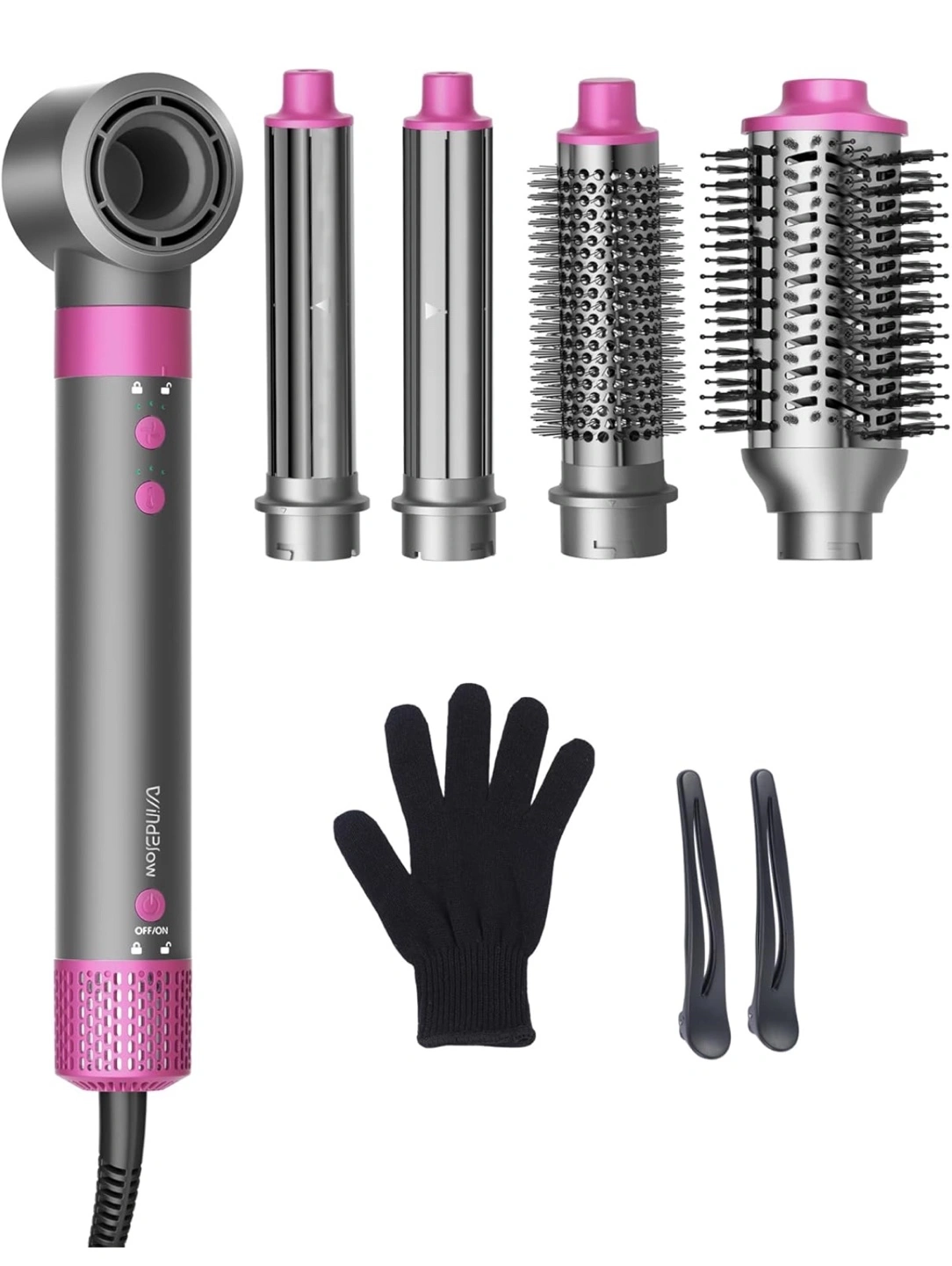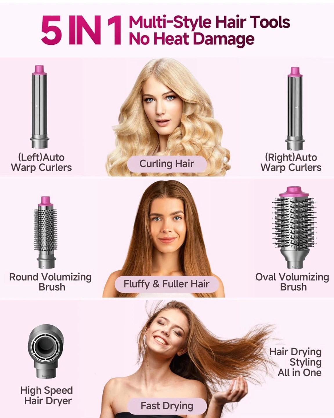 5-in-1 hair styling tool. Includes auto-wrap curlers, volumizing brushes, and a hair dryer. Fast drying and styling. Save time. Coanda effect. Multiple attachments. Heat protection.