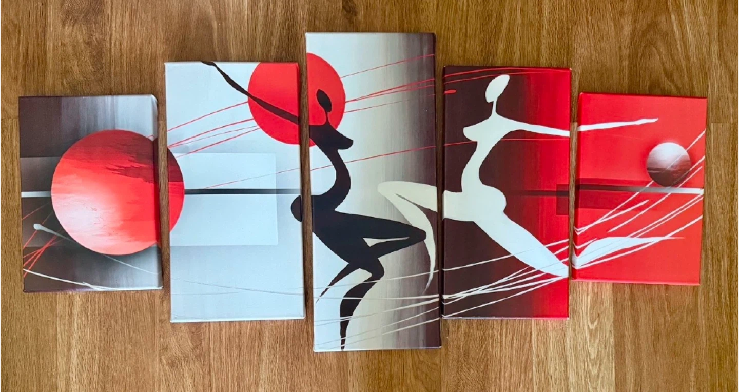 Selling a beautiful 5-panel canvas wall art set. The artwork features a modern design with red and black accents. It's perfect for adding a touch of elegance to any room! Barely used, like new!