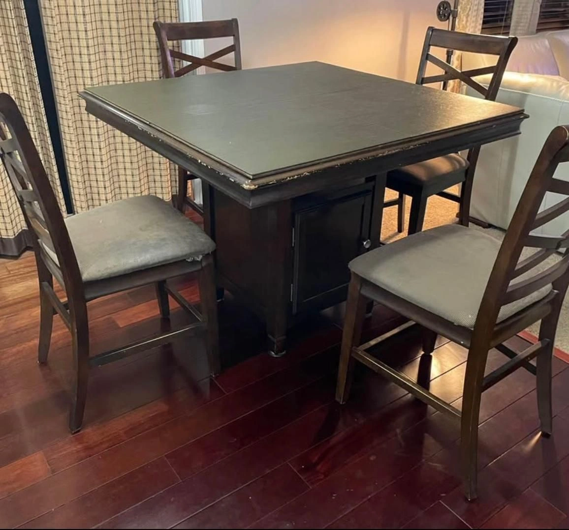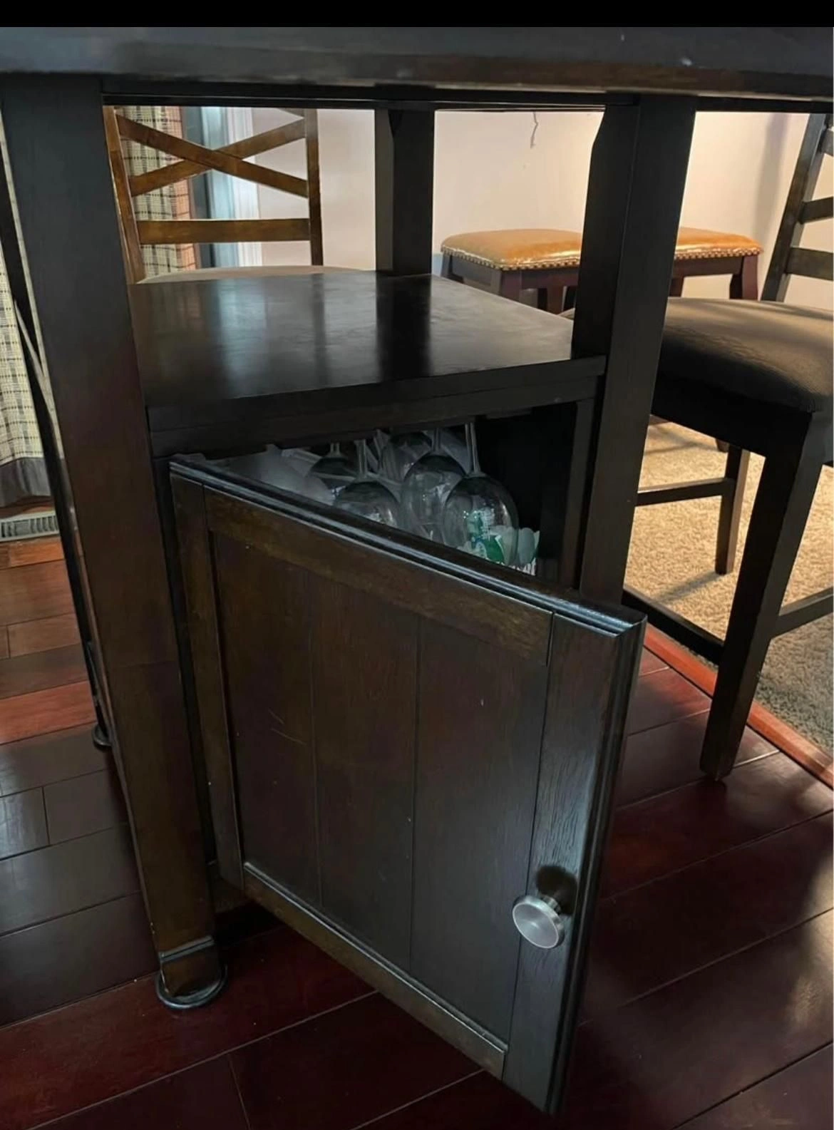 10It’s square high dinning with four chairs. Dark cherry wood with storage at the bottom with wine glass holder and doors. Have customized magnetic heat pad to give along with the dinning. Color: Brown