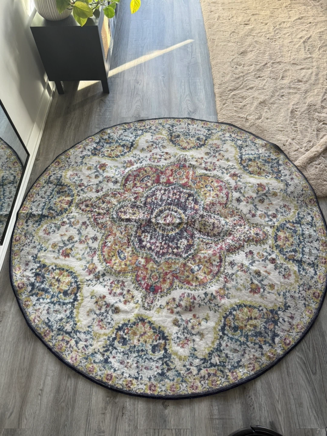 94Selling a round area rug with a beautiful floral pattern. It has a mix of colors including white, red, yellow, and blue. It's in good condition and would look great in any room!