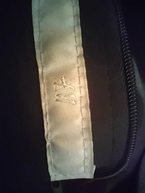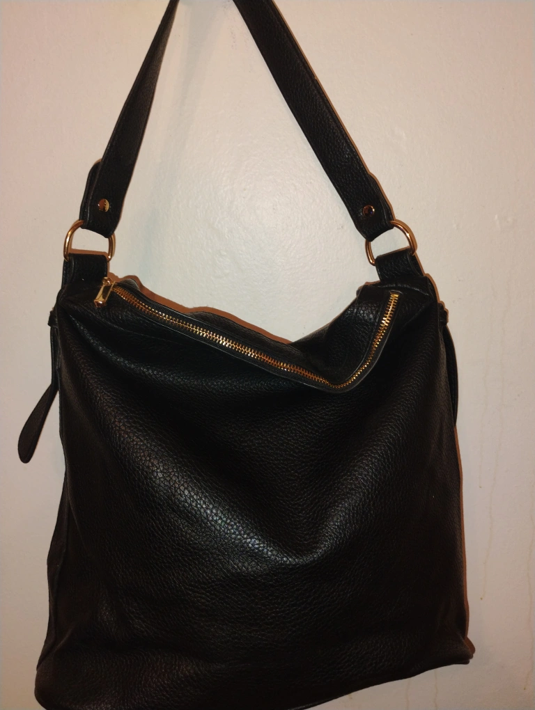 Black leather-like shoulder bag. Gold-tone hardware. Top zipper closure. Single shoulder strap. Roomy interior.