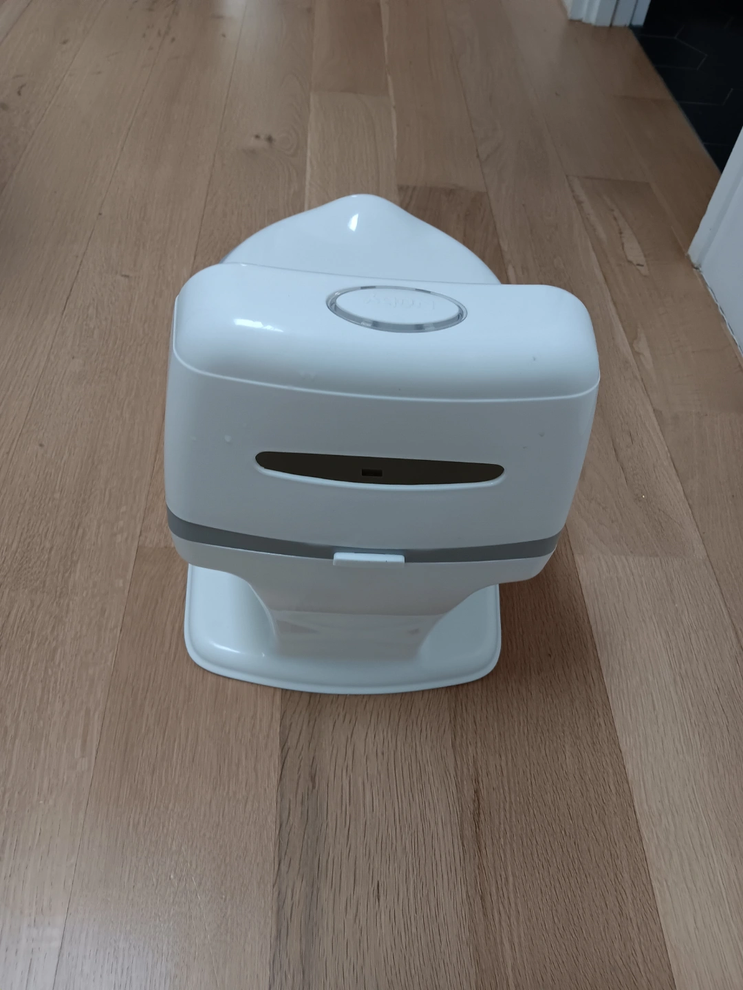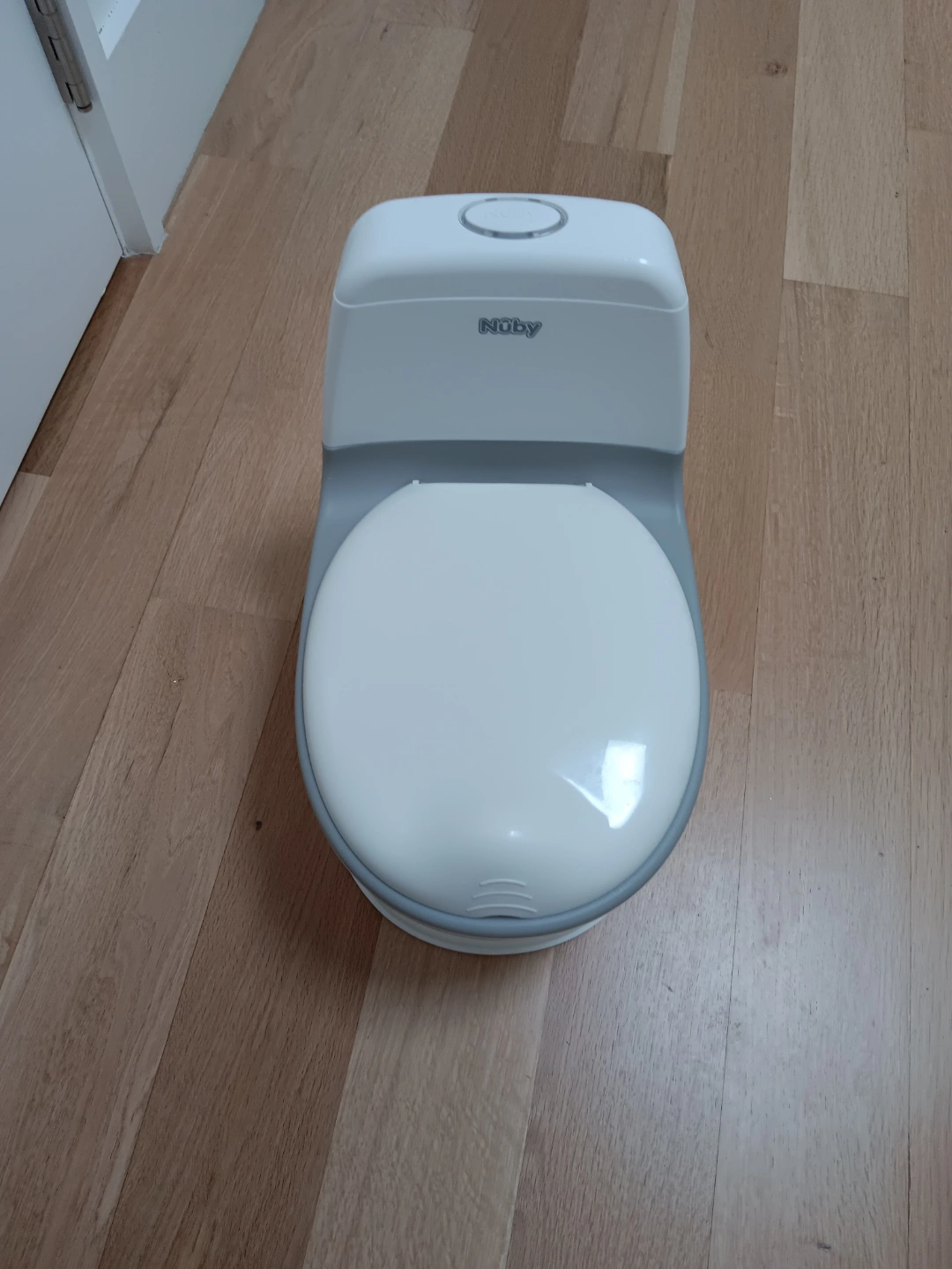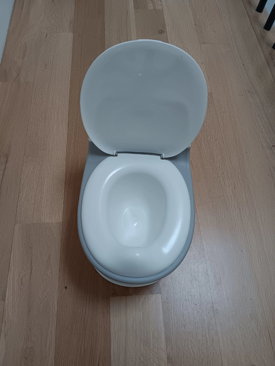 White and gray potty training toilet. Features a lid and removable inner pot. Good for toddlers.