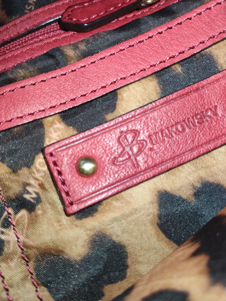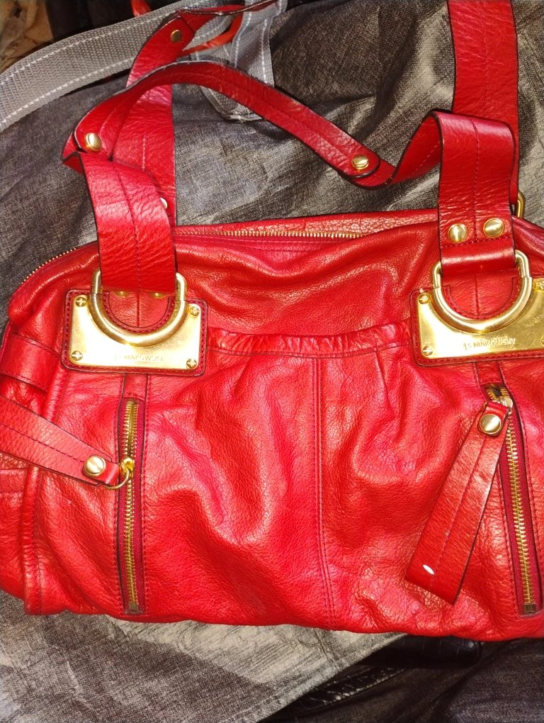 79Beautiful red leather handbag. Multiple pockets and zippers. Gold-tone hardware. Shoulder straps.