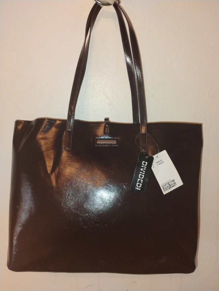 Dark brown tote bag. Features two shoulder straps and a small metal accent. One size fits all.