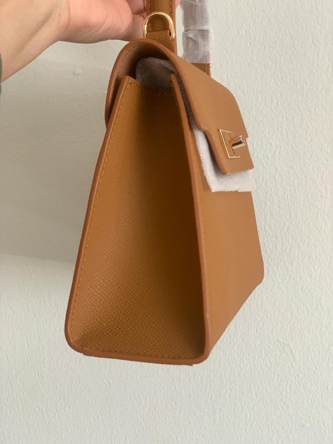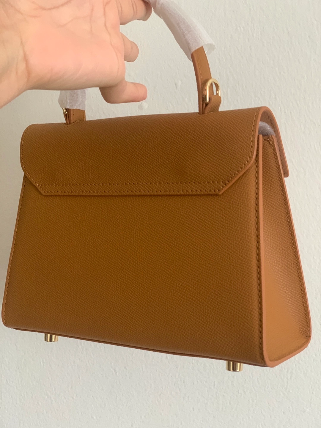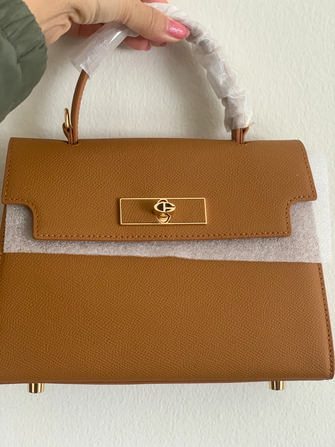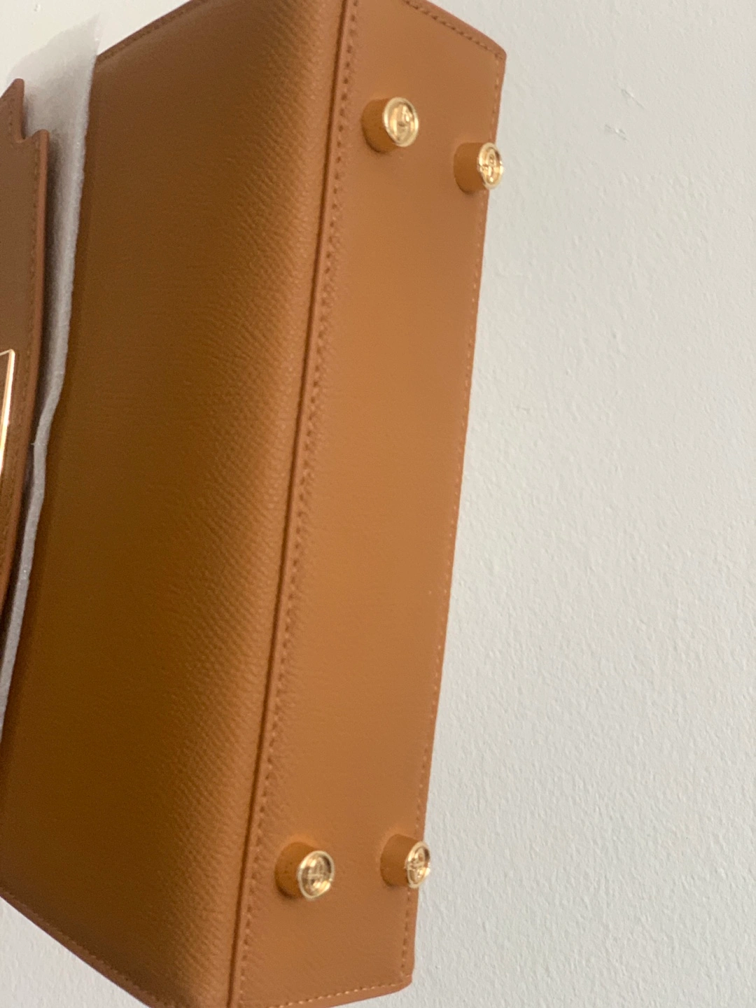 275Gorgeous tan leather satchel. Features gold-tone hardware and a top handle. Protective feet on the bottom. Small and stylish.