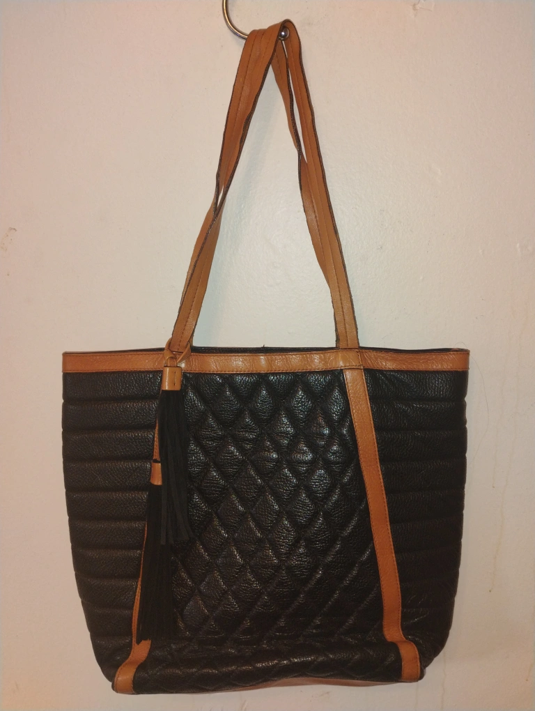 Black quilted leather tote bag. Brown leather trim. Two tassels. Interior zipper pocket. Made in Italy.