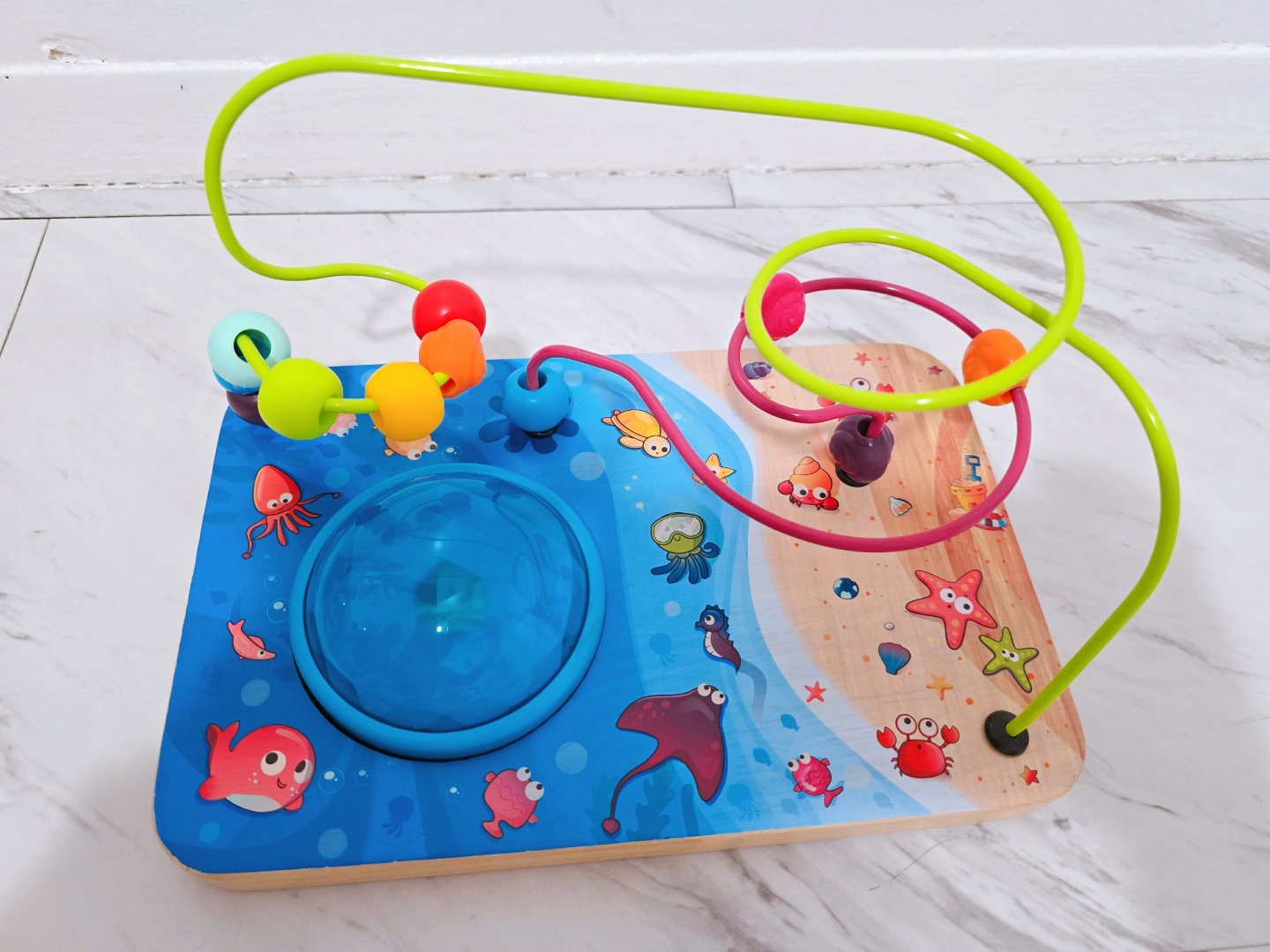 Developmental toy for toddlers. Features sounds, lights, and a musical bead maze. Includes colorful beads and wires. Wooden base with ocean theme. Great for improving fine motor skills.