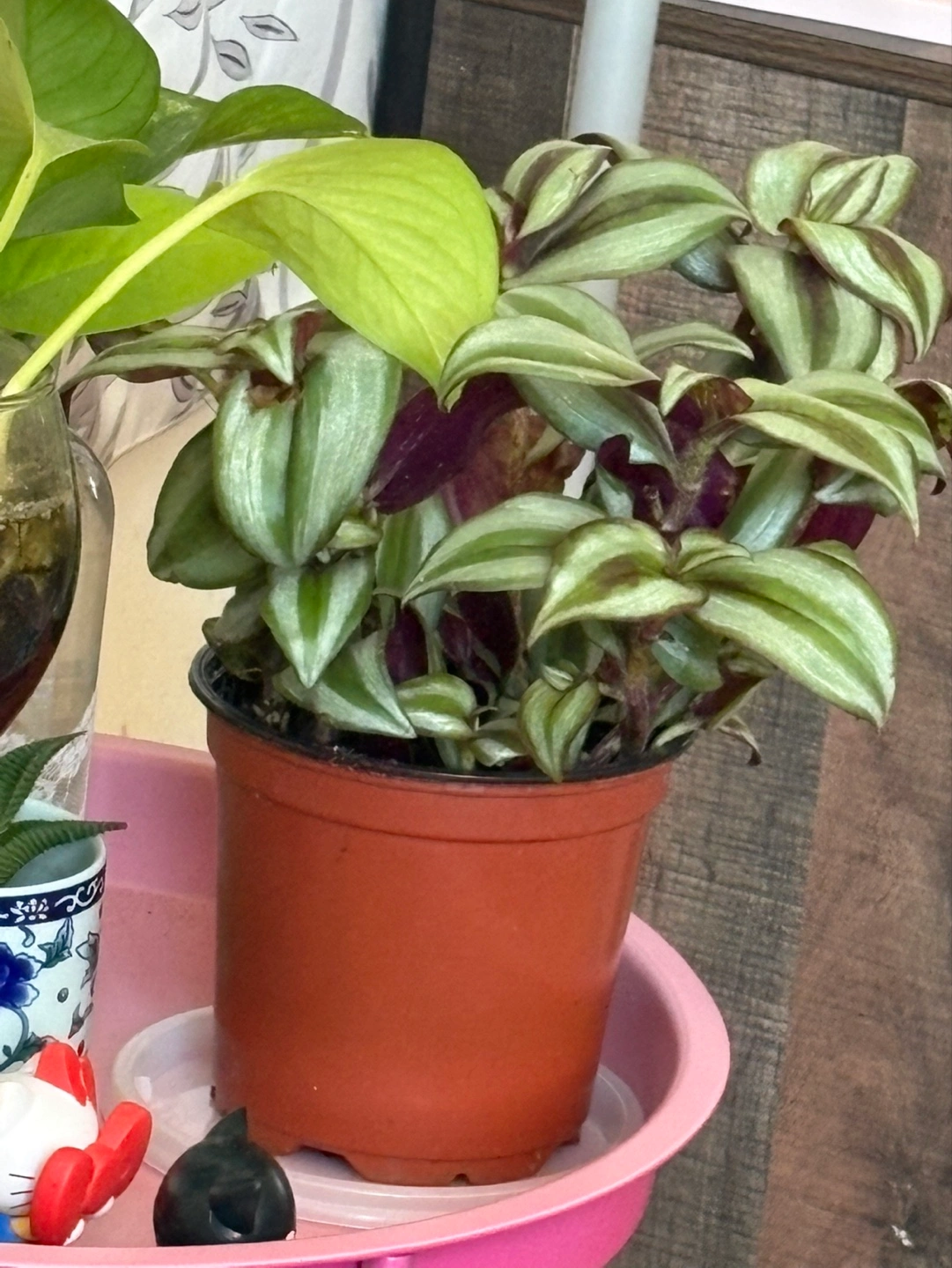 Healthy Tradescantia Nanouk in a plastic pot. Purple and green leaves. Great addition to your indoor garden.