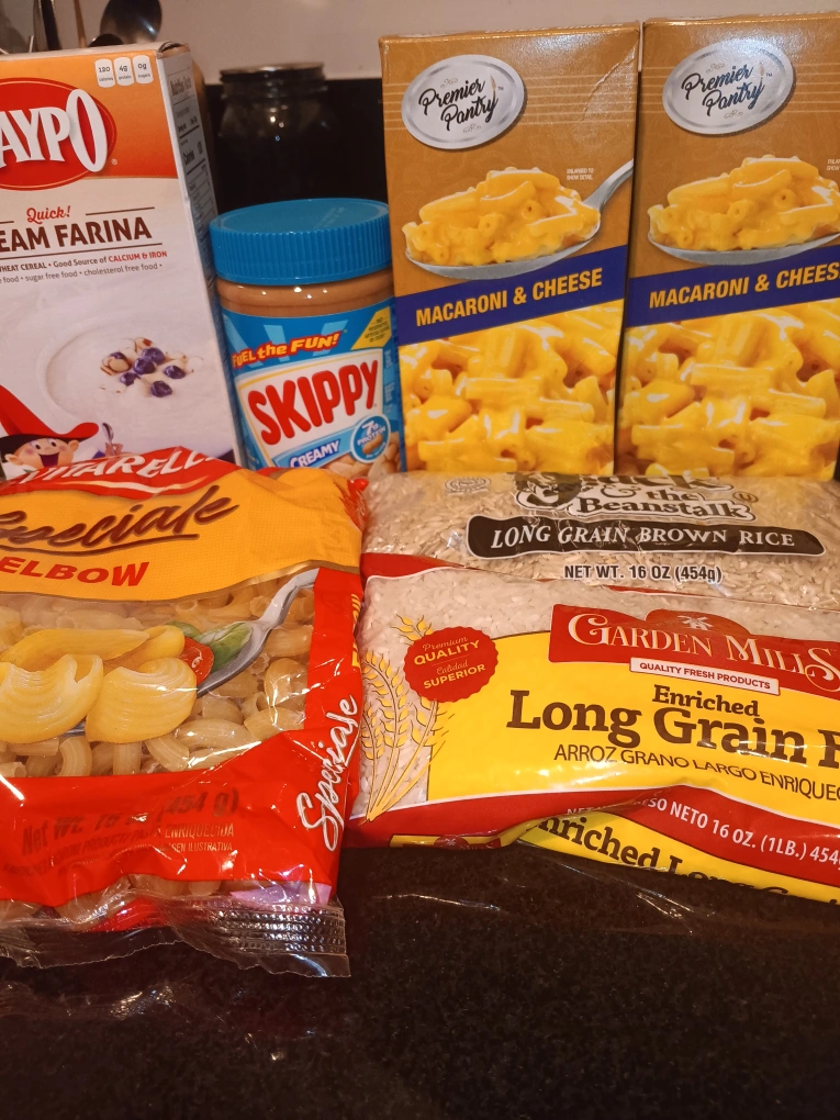 756Variety pack of pantry staples. Includes two boxes of macaroni and cheese, a bag of brown rice, a bag of elbow macaroni, a jar of creamy peanut butter, and a box of cream of wheat cereal.