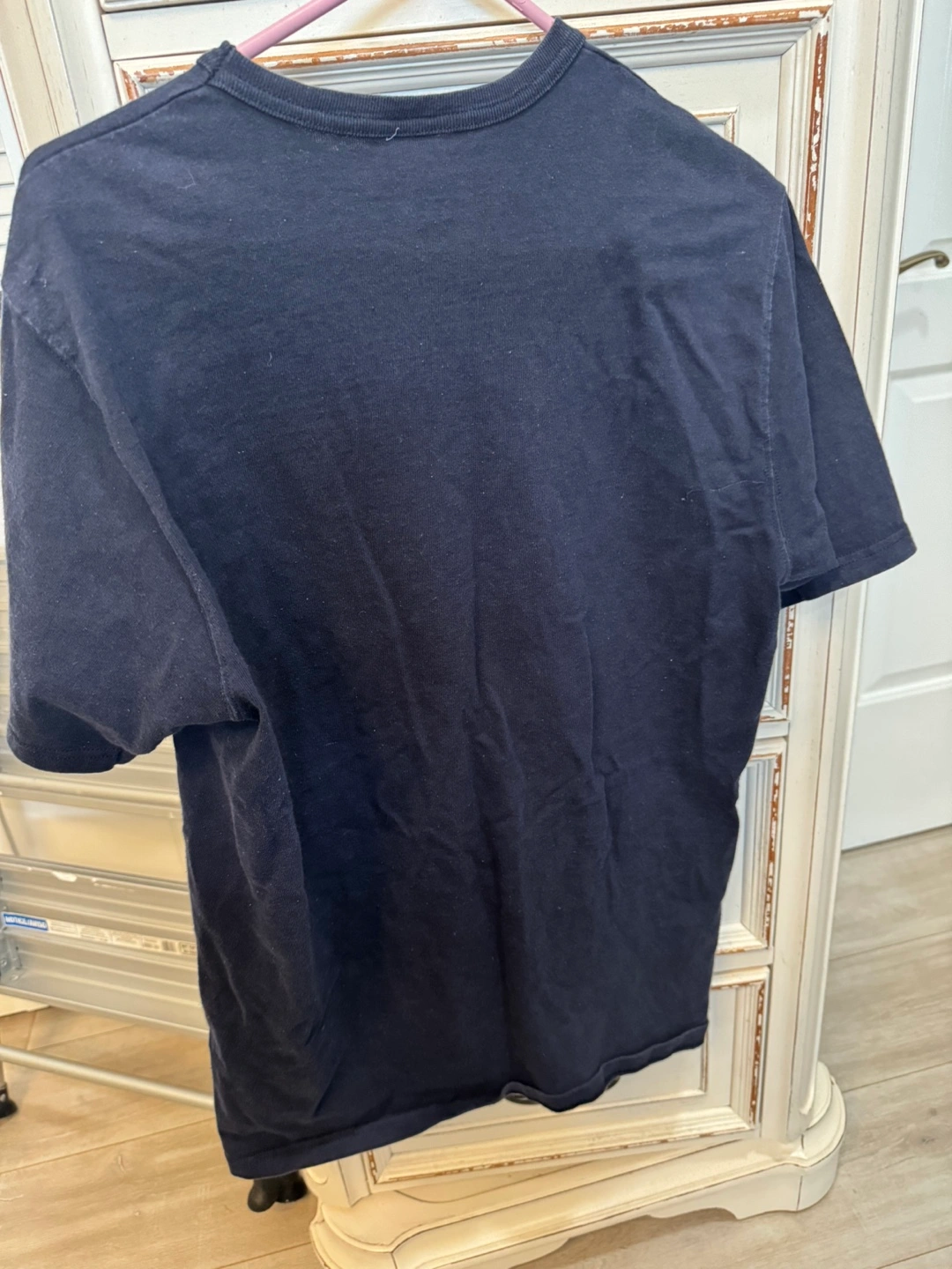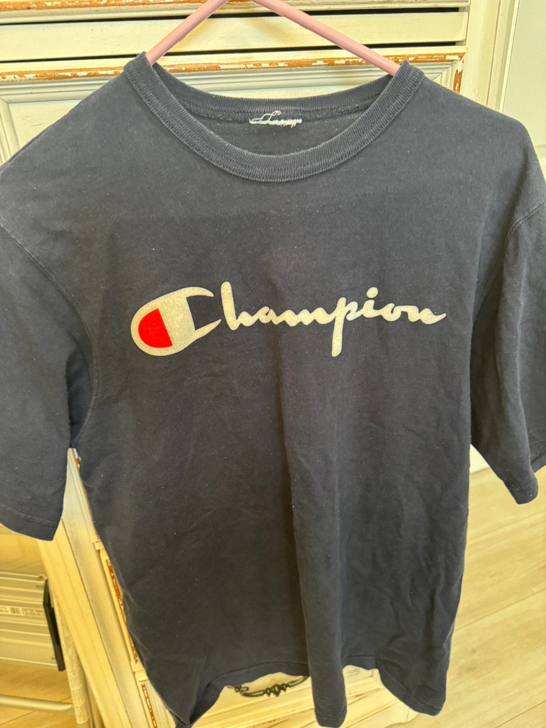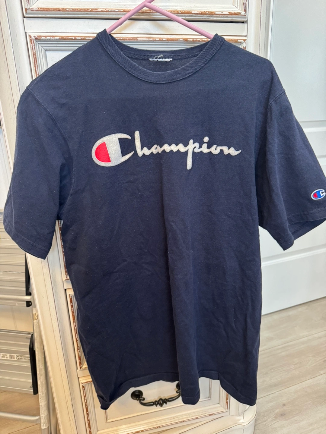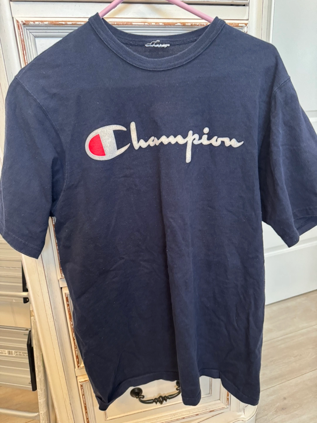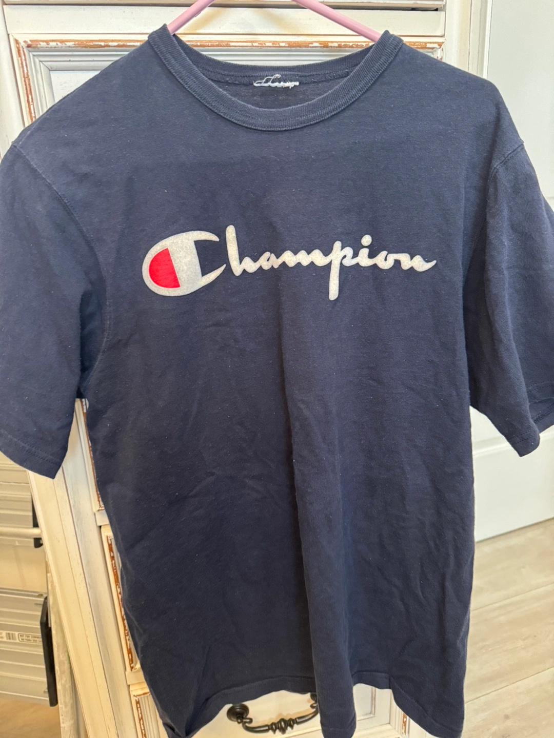 Men's short sleeve t-shirt. Navy blue color. Features a large Champion logo on the front. Good condition.