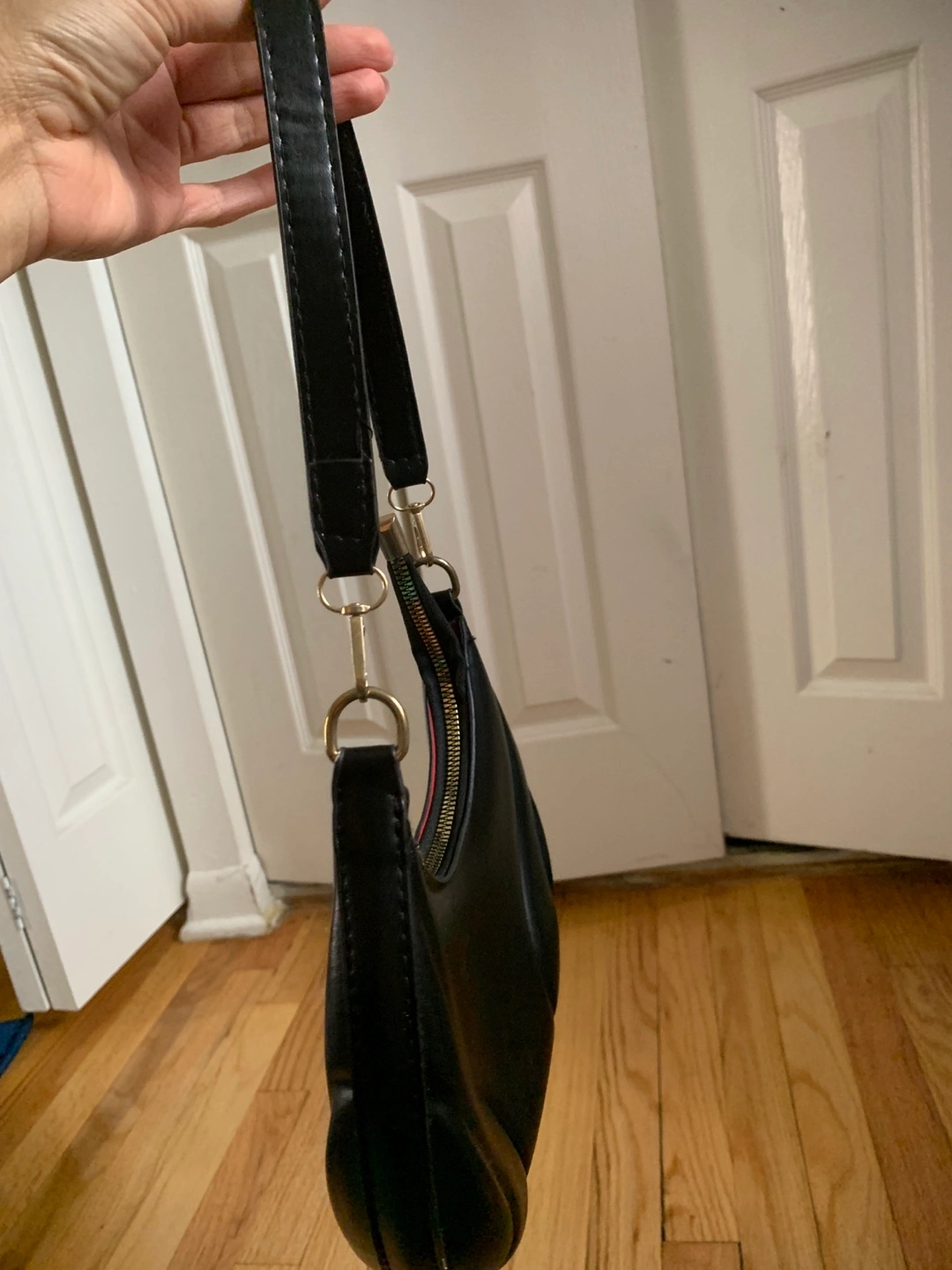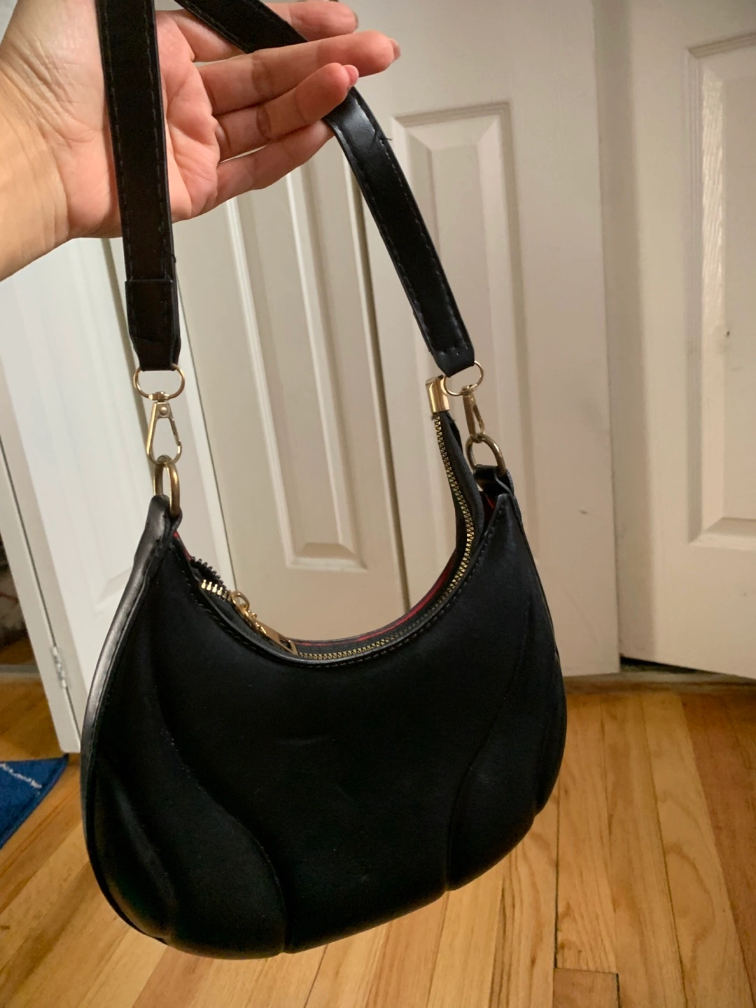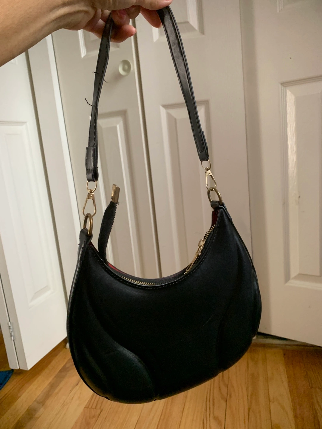 Small black handbag. Features a half-moon shape and quilted design. Short shoulder strap. Zipper closure. Gold-toned hardware.