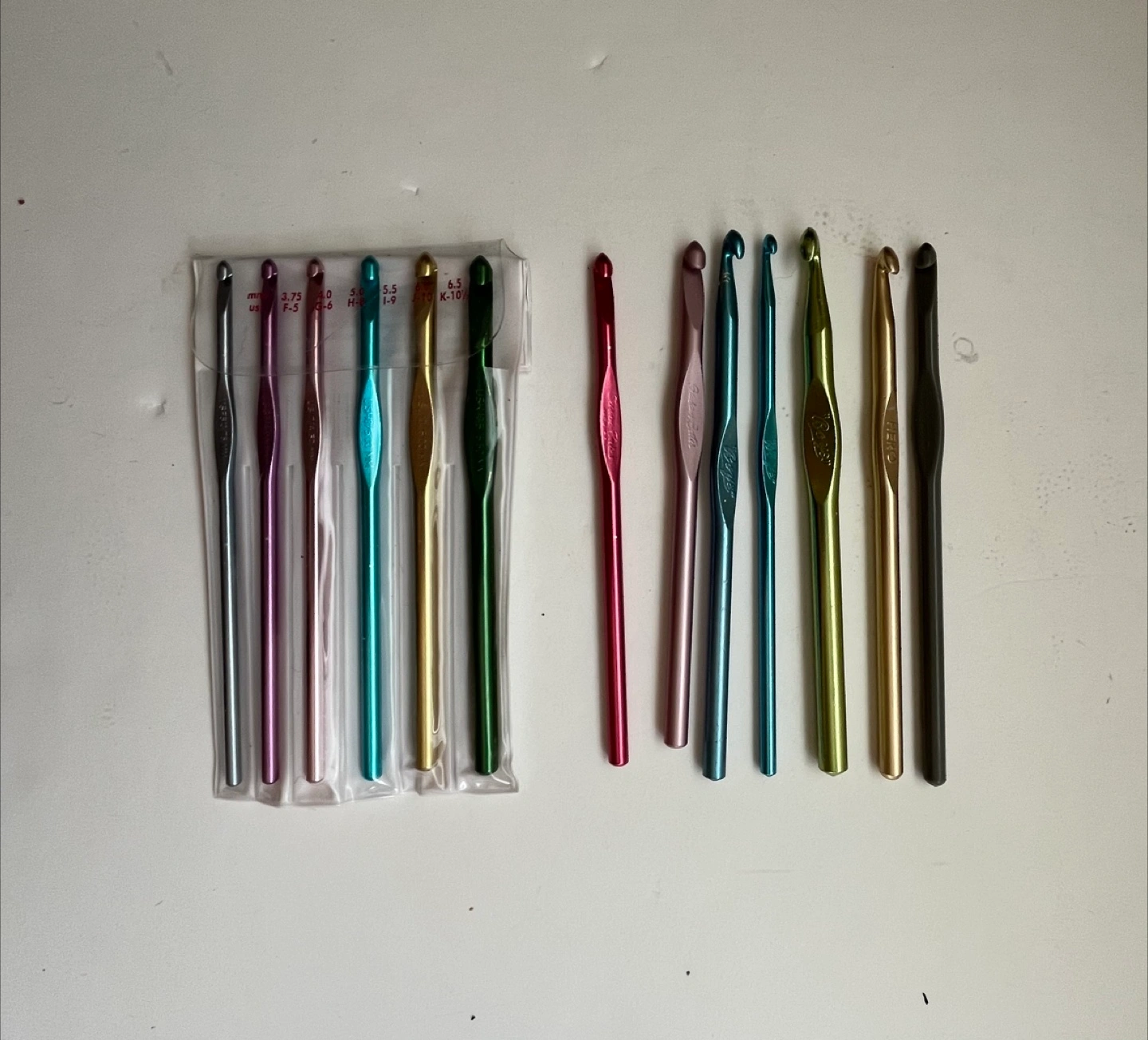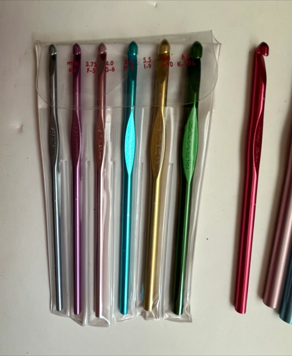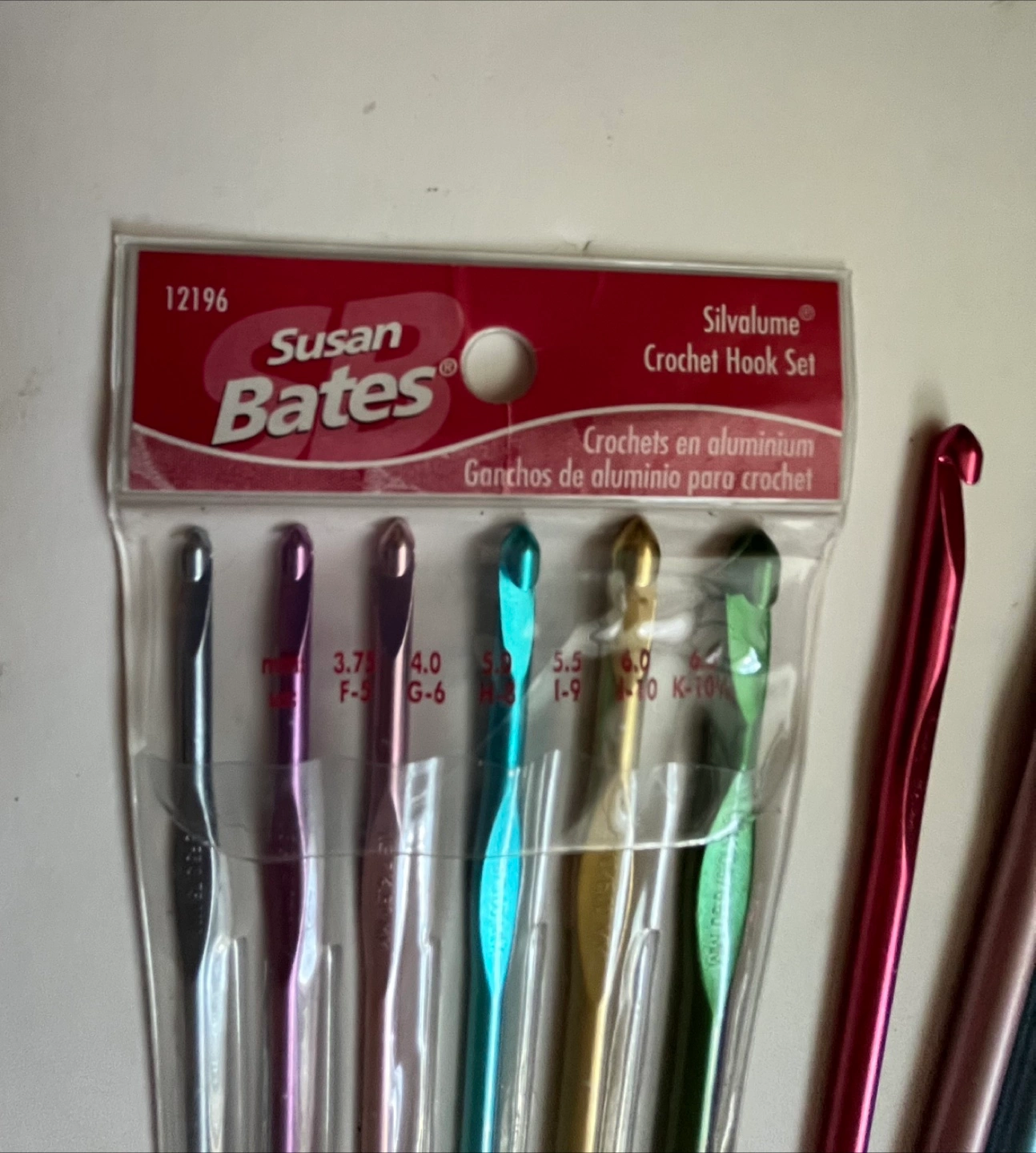 75Set of 12 crochet hooks. Includes sizes 3.75mm - 6.5mm. Aluminum hooks. Various colors. New and unused in package.