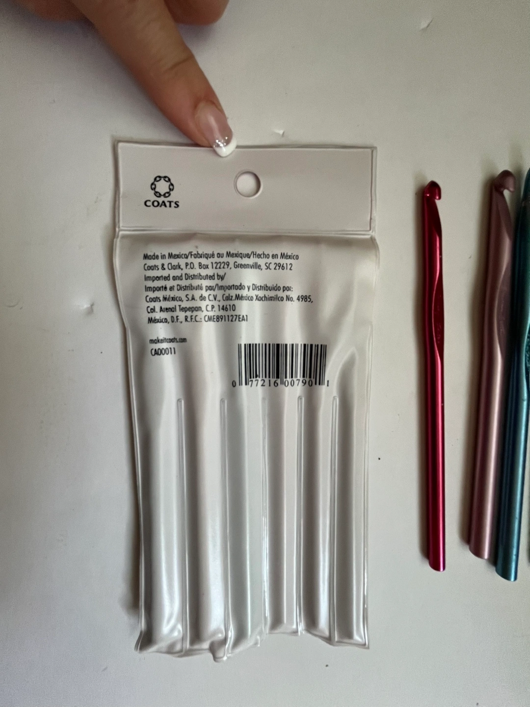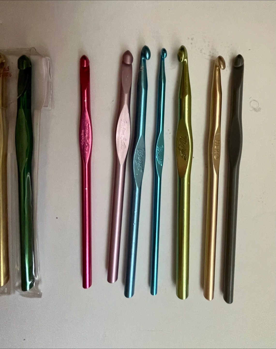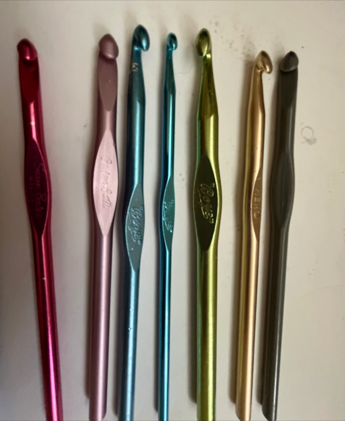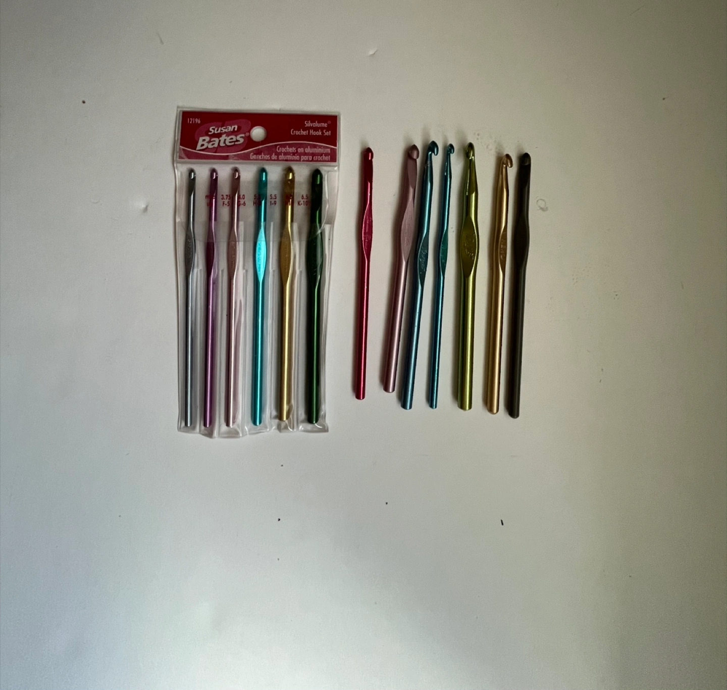 75Set of 12 crochet hooks. Includes sizes 3.75mm - 6.5mm. Aluminum hooks. Various colors. New and unused in package.