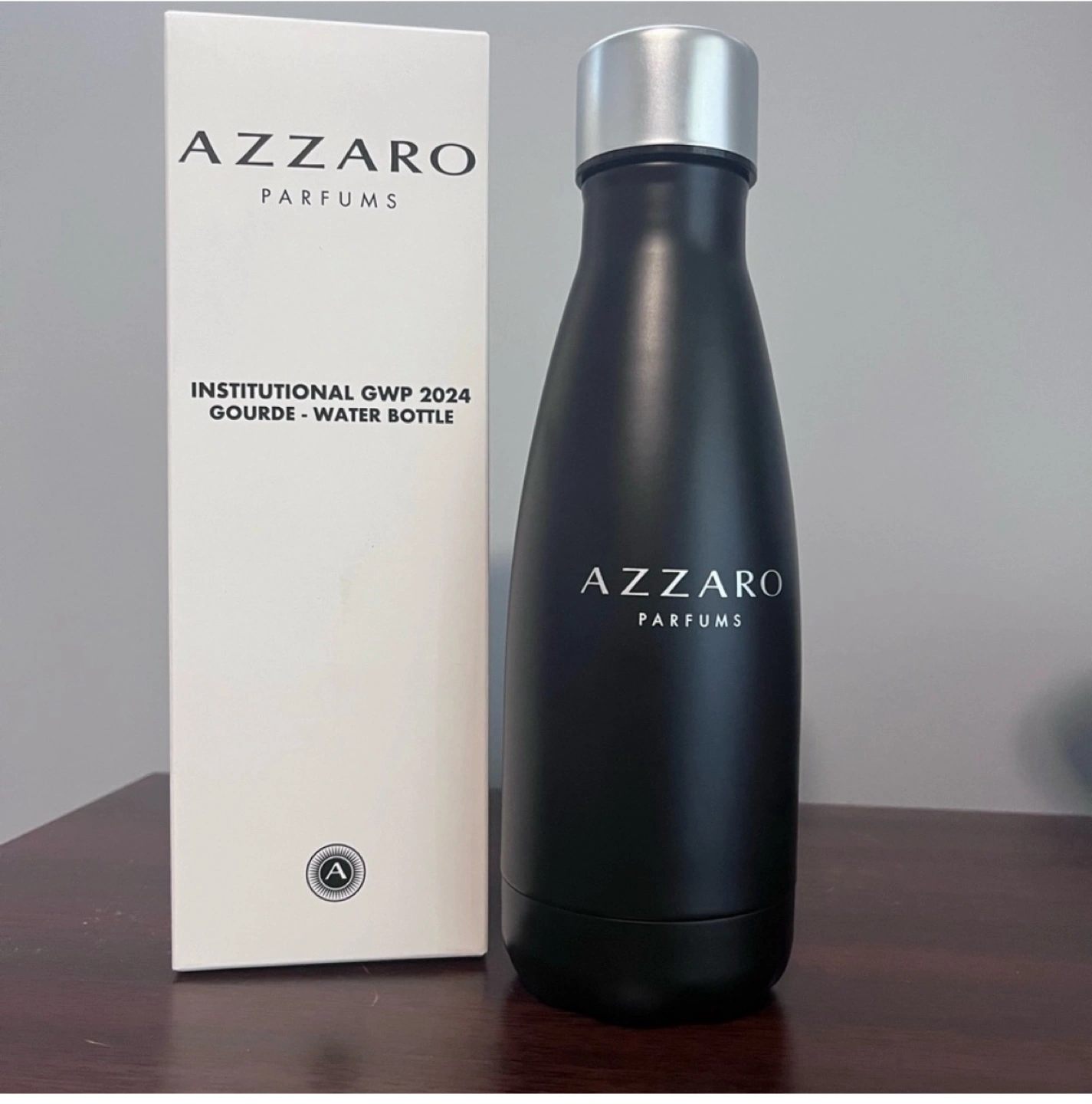 New in Box Azzaro Stainless Steel Water Bottle Approximate size 8 1/2 inches high 21/2 inches across the base ***MAKE A BUNDLE OF 3 or More items from List for 30% DISCOUNT***