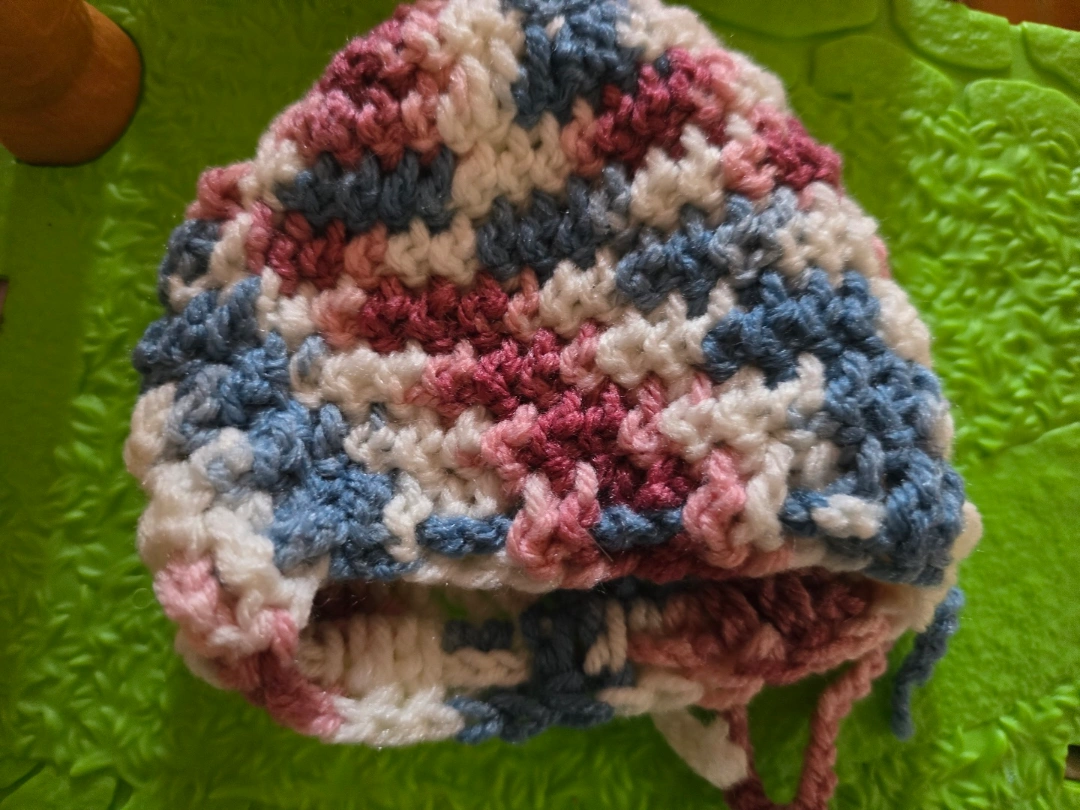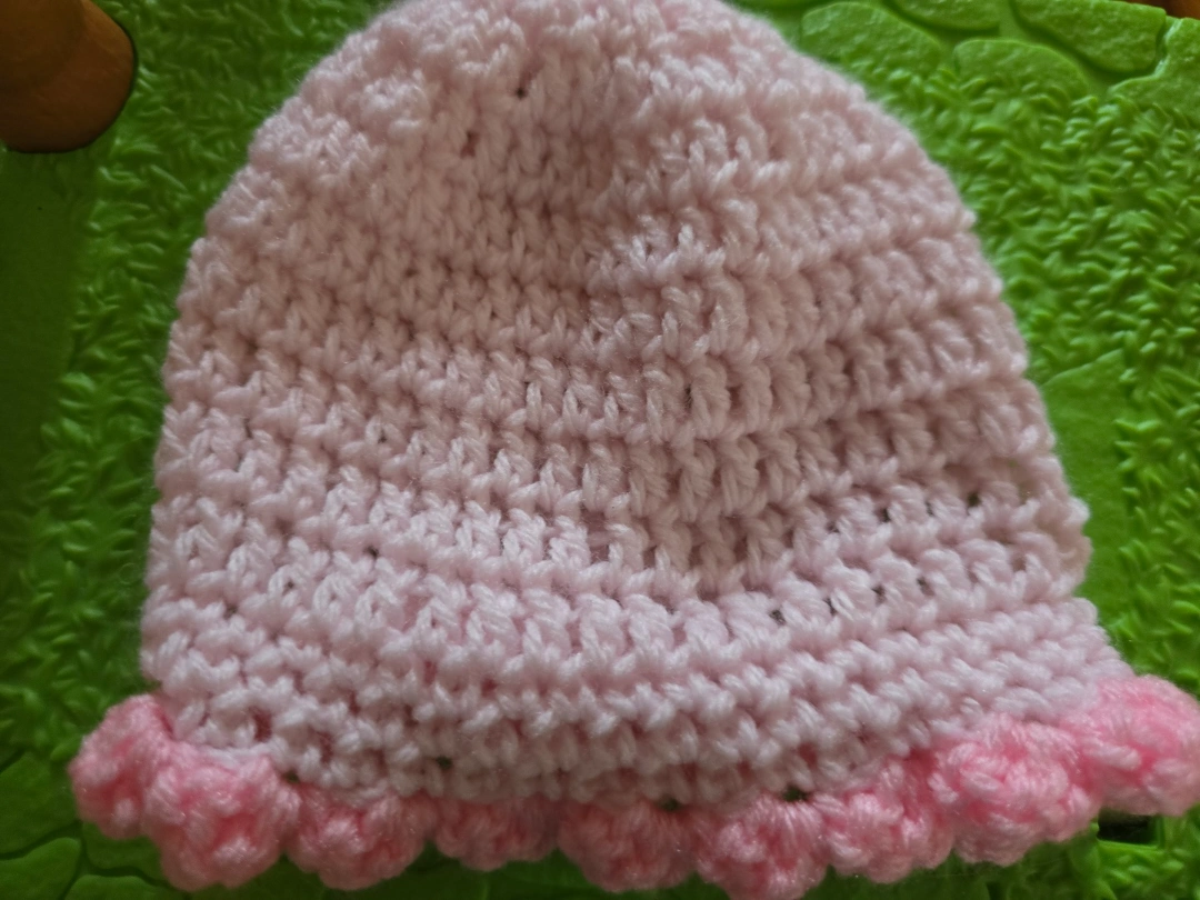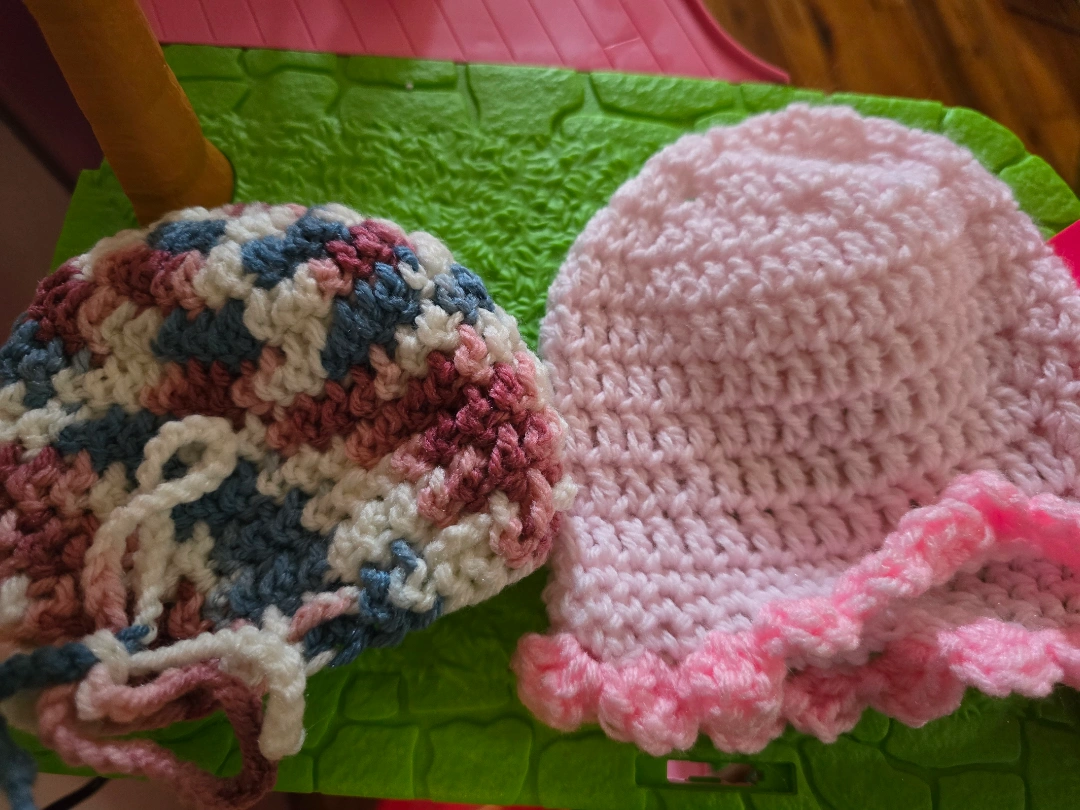 1000+Adorable handmade crochet baby hats. Set includes one multicolored hat with pink, white, and blue and one solid pink hat with a pink scalloped edge. Perfect for newborns or small babies. Soft and cozy. #freecycle