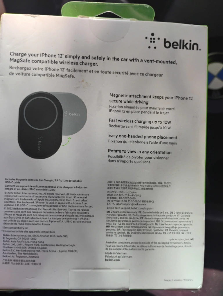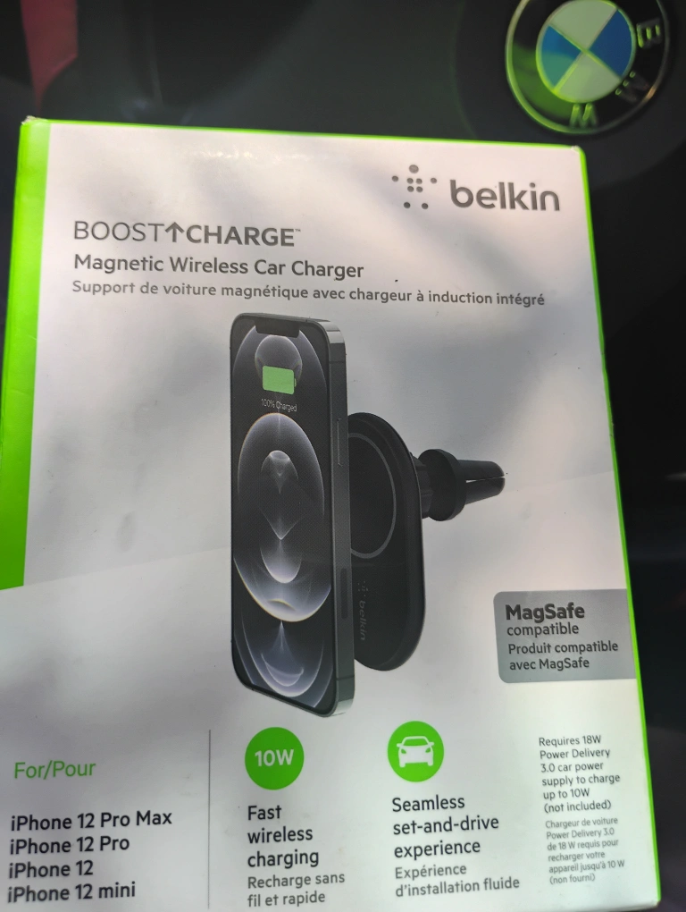 Magnetic attachment keeps phone secure while driving. Fast wireless charging up to 10W. Easy one-handed placement. Rotatable to pivot for any orientation. Compatible with iPhone 12 mini, iPhone 12, iPhone 12 Pro, iPhone 12 Pro Max. Requires 18W power delivery 3.0 car power supply (not included).