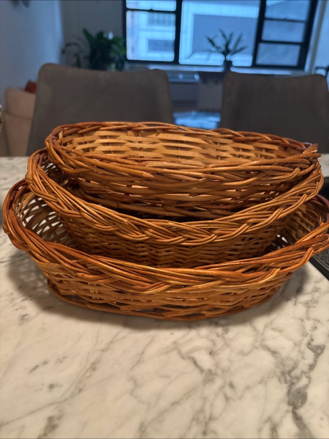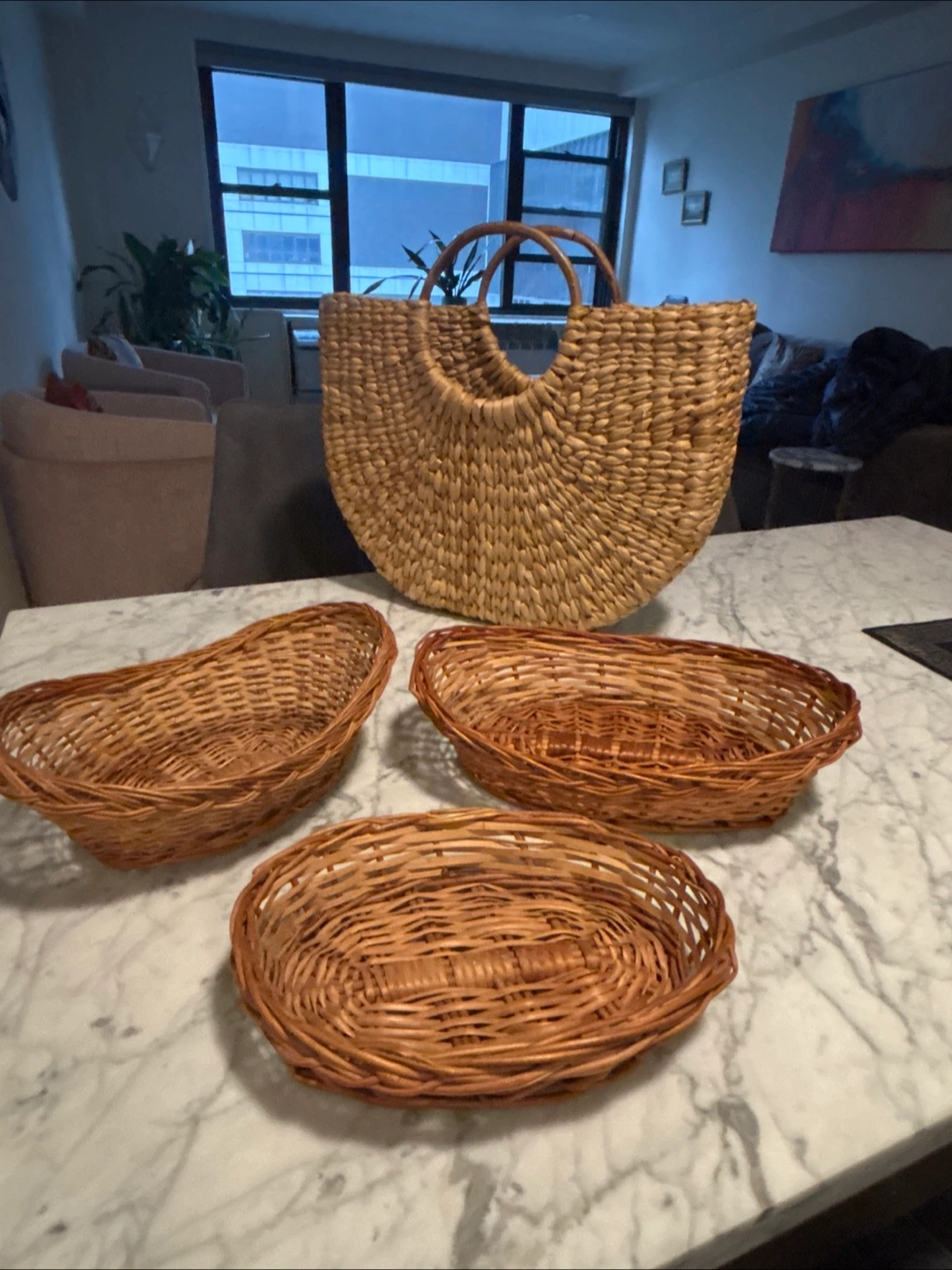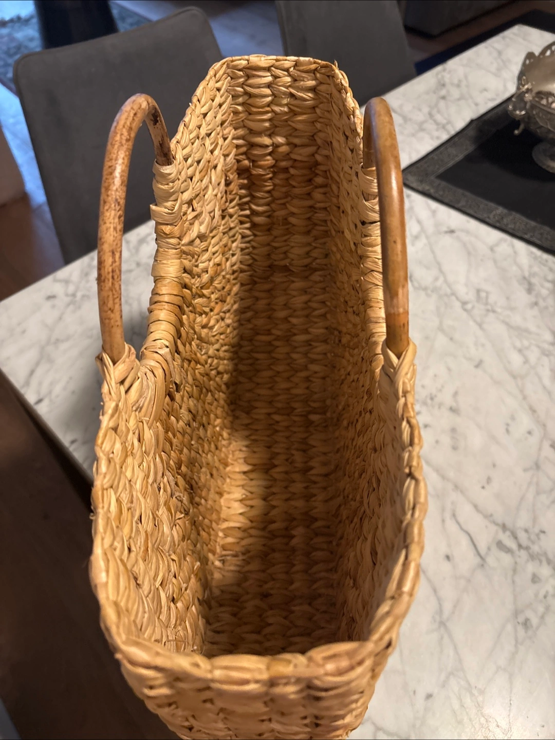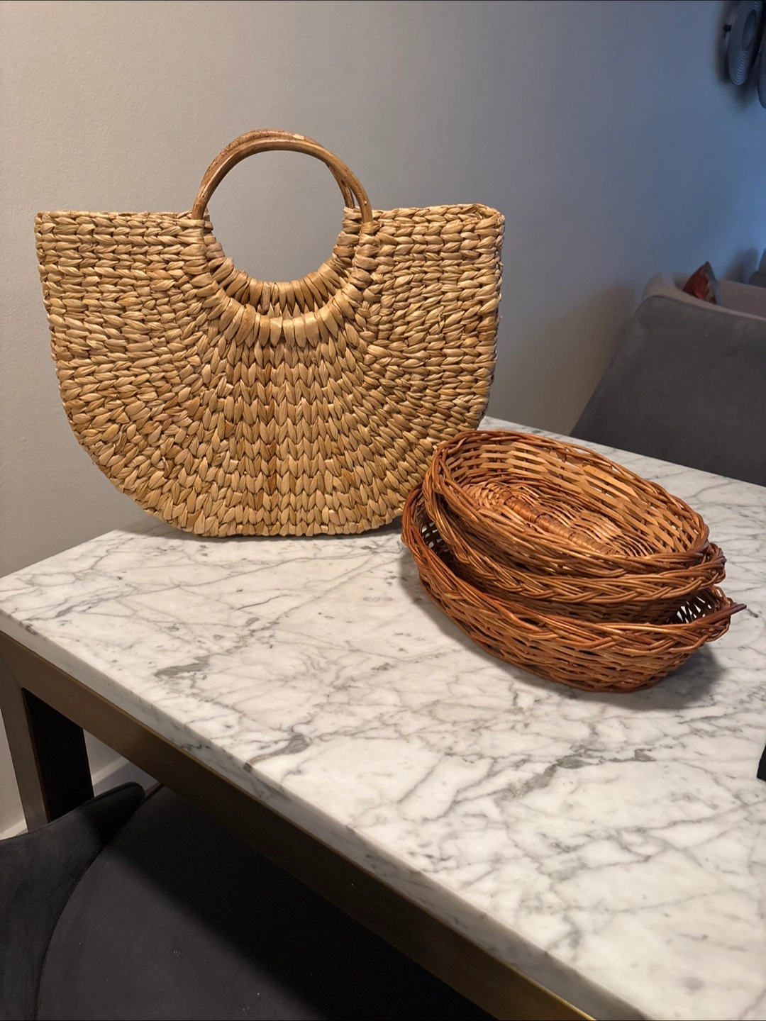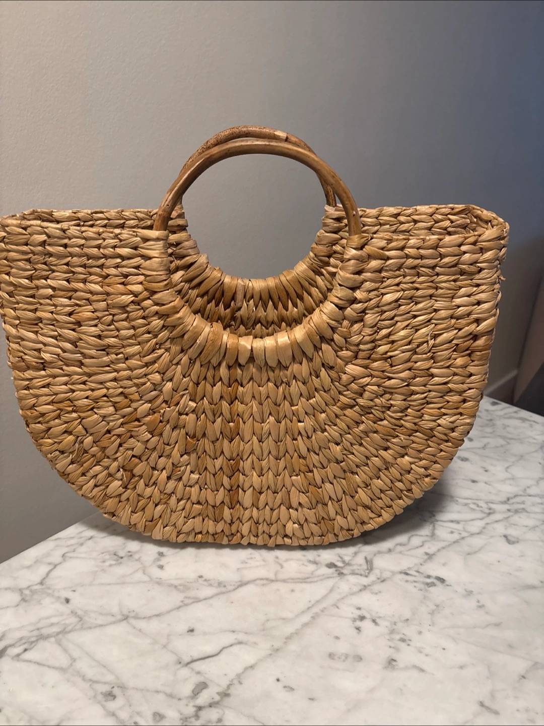 347Spacious straw tote bag. Natural woven design. Wooden handles. Perfect for summer. Includes 3 tray baskets