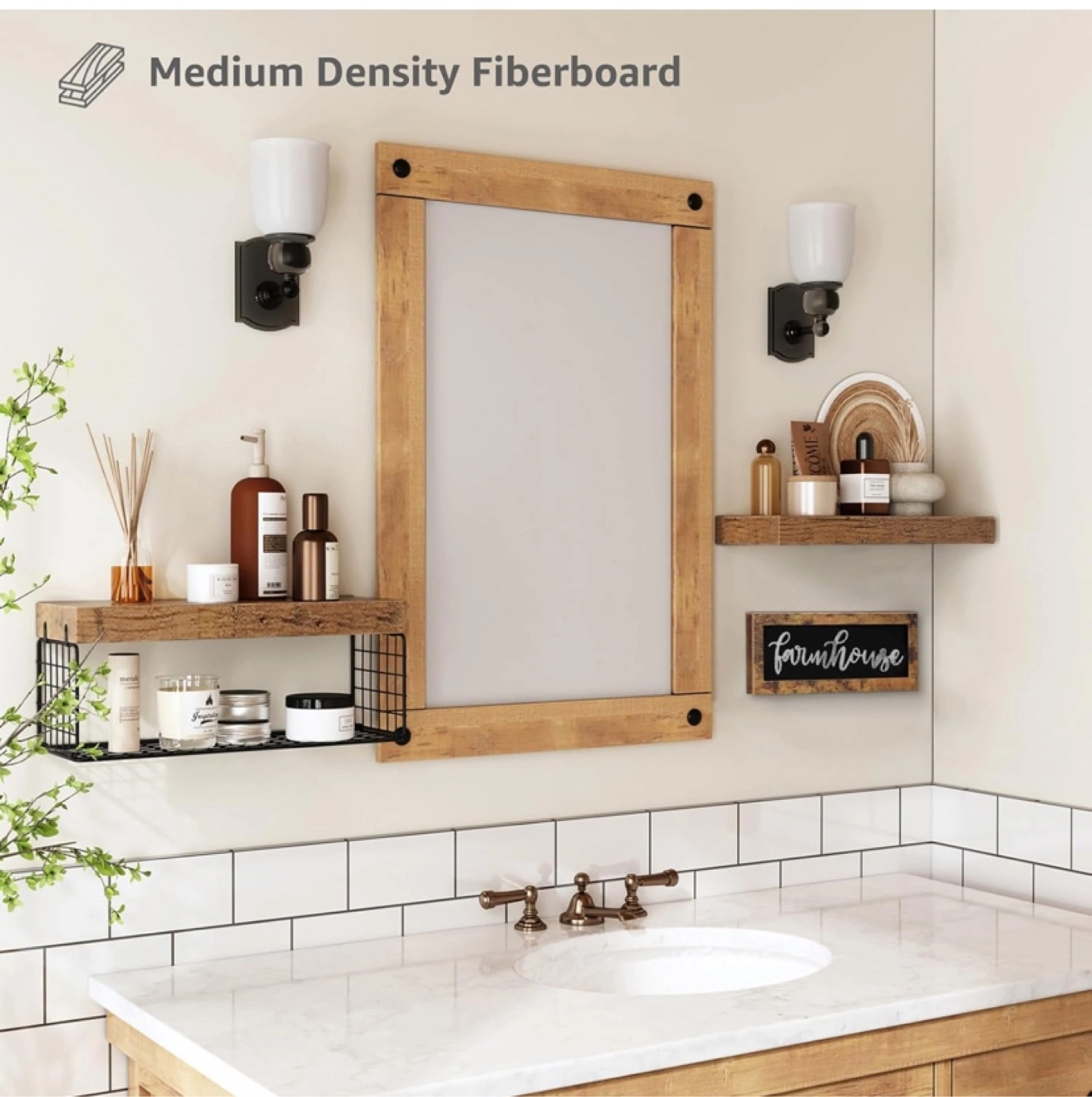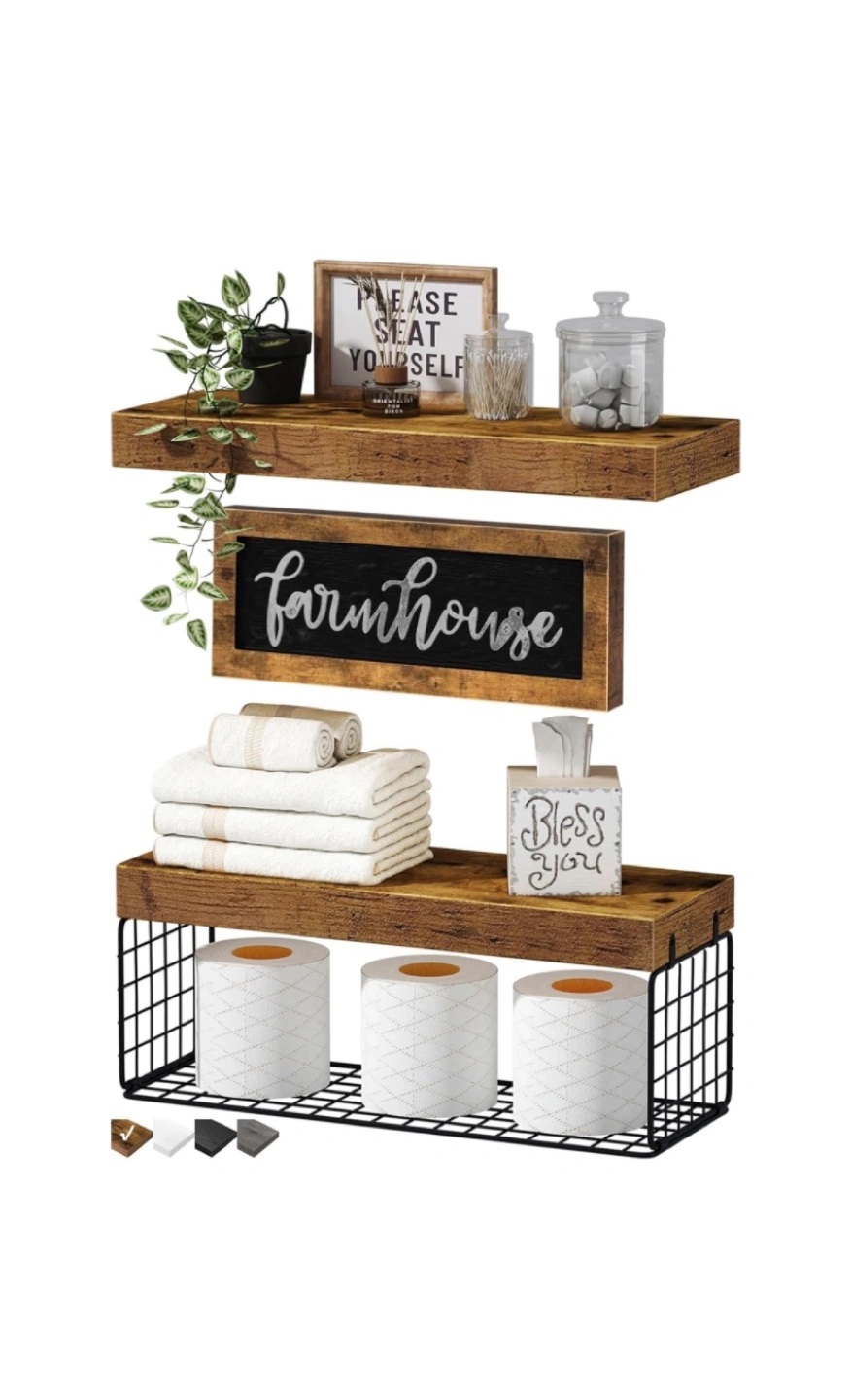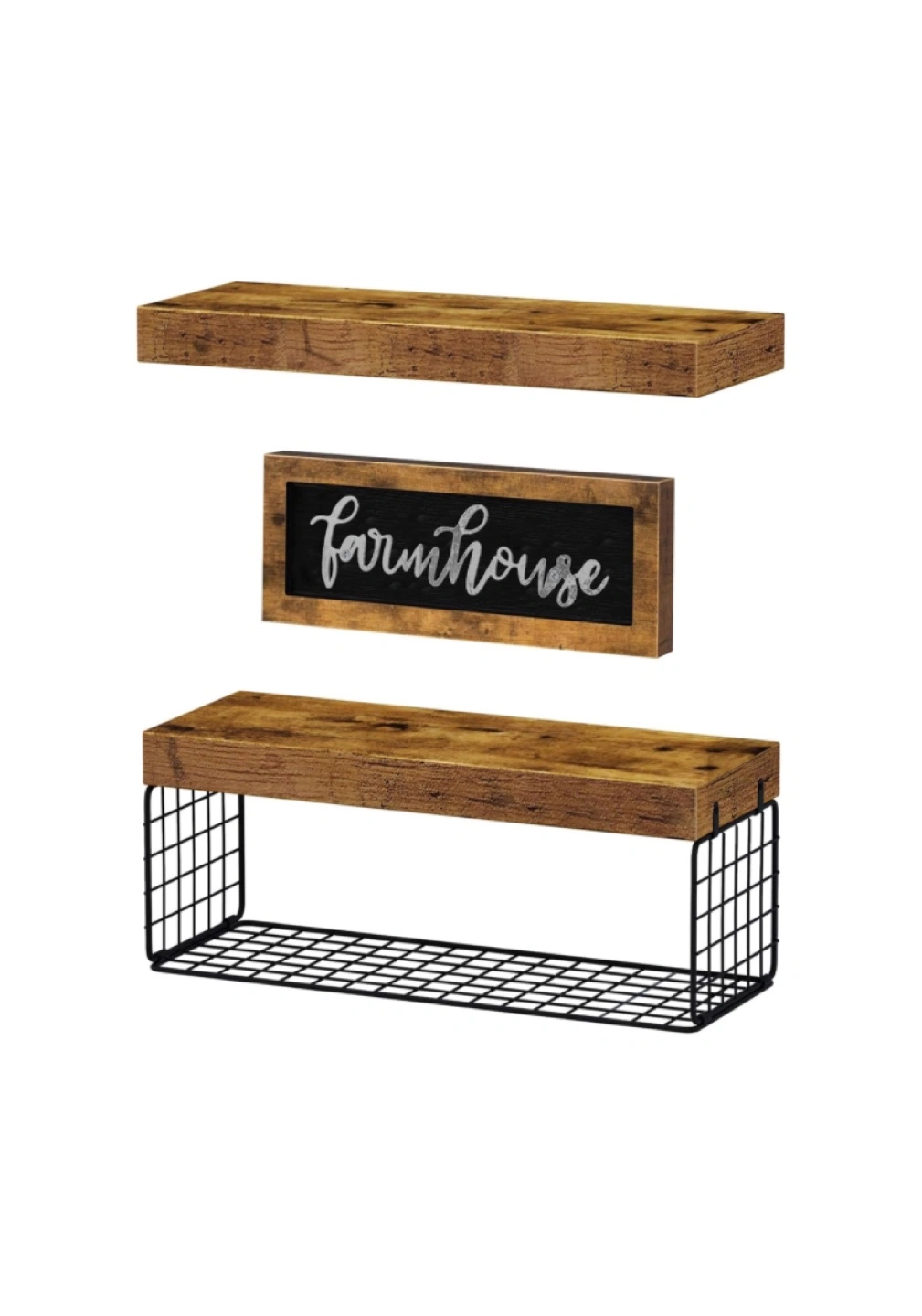 Three-piece bathroom shelf set. Includes two floating shelves and one shelf with a wire basket. Features a rustic brown wood finish and black metal accents. Comes with a farmhouse sign. Perfect for bathroom organization and storage.