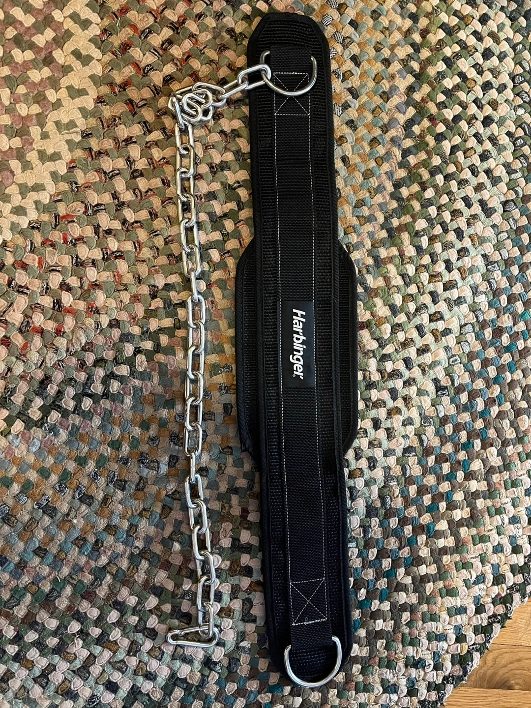 Black weightlifting belt. Durable nylon construction. Includes metal chain. Great for powerlifting.