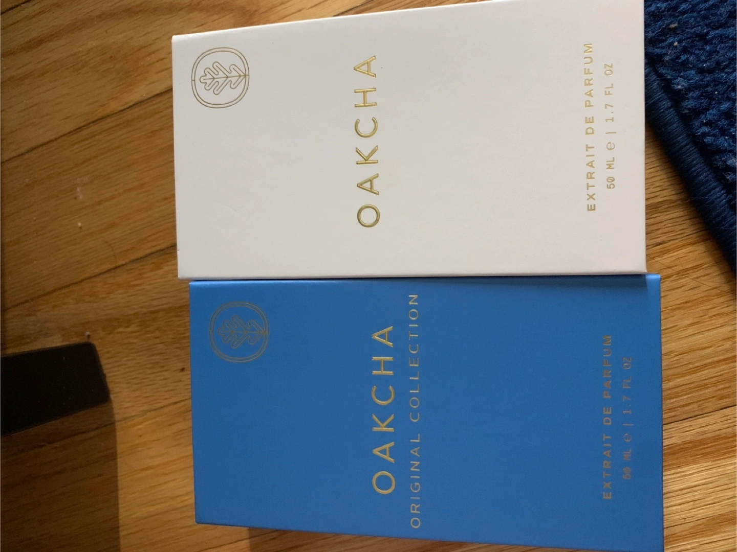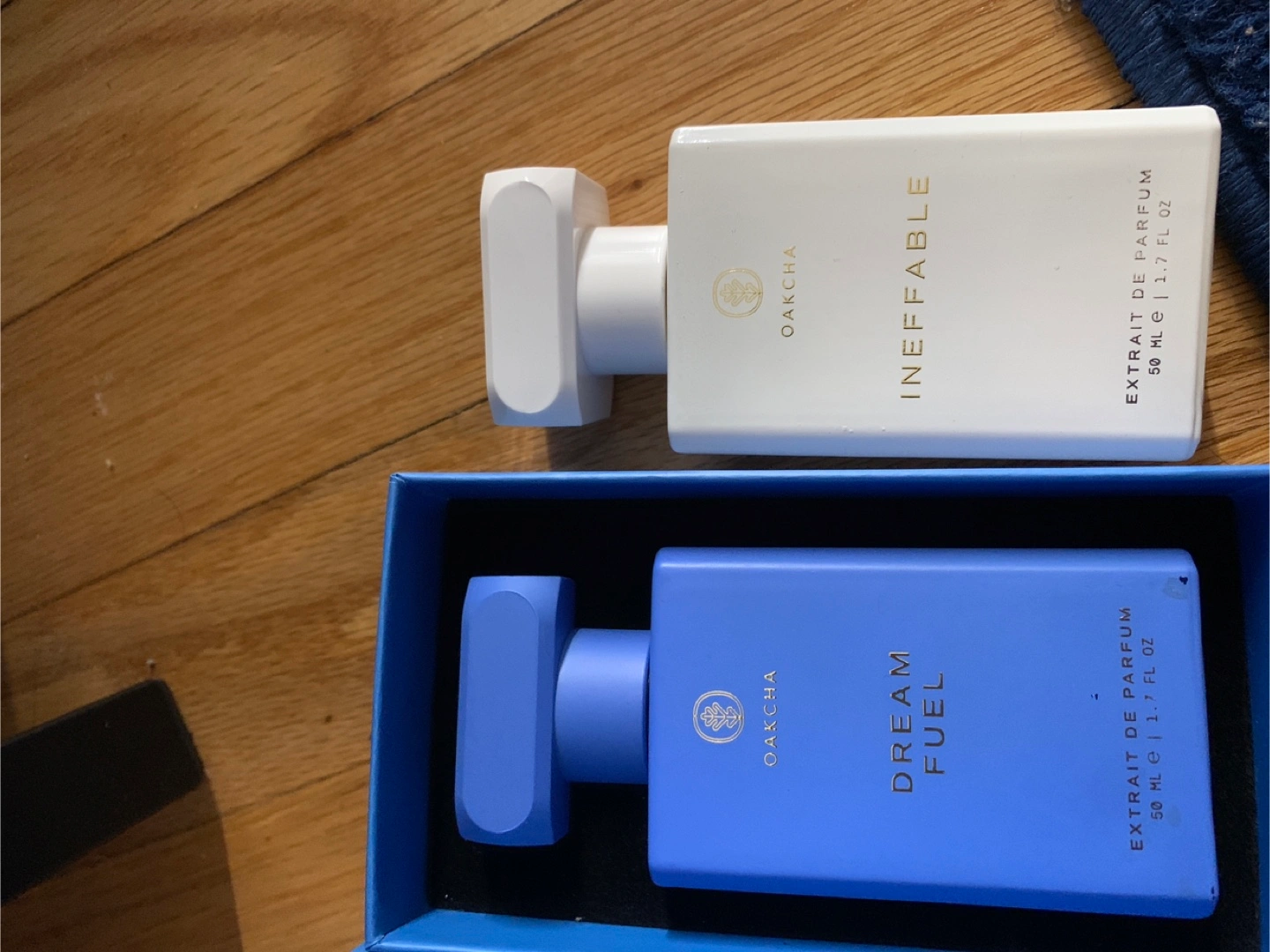Two 50ml OAKCHA perfumes. One white bottle labeled Ineffable, one blue bottle labeled Dream Fuel. Original boxes included. Extrait de Parfum.
