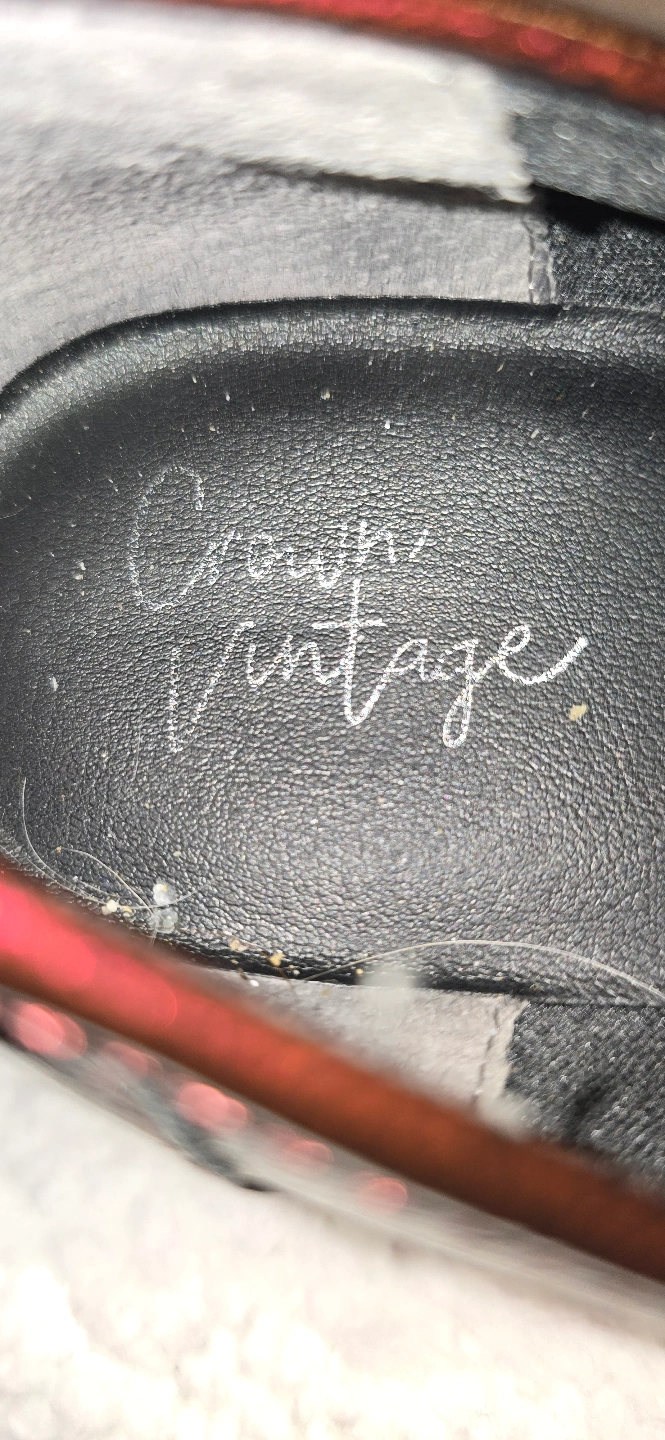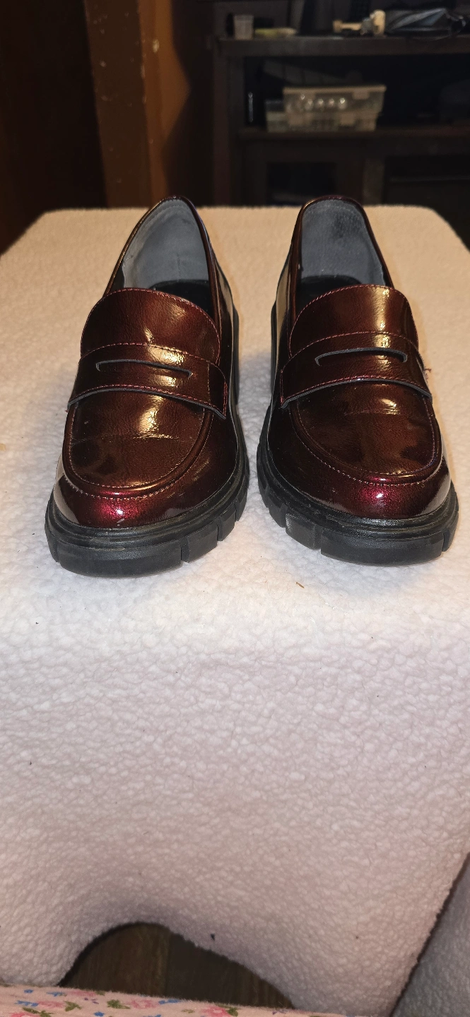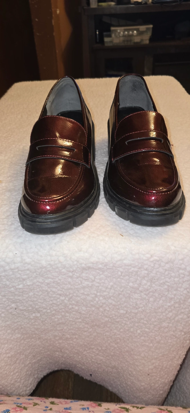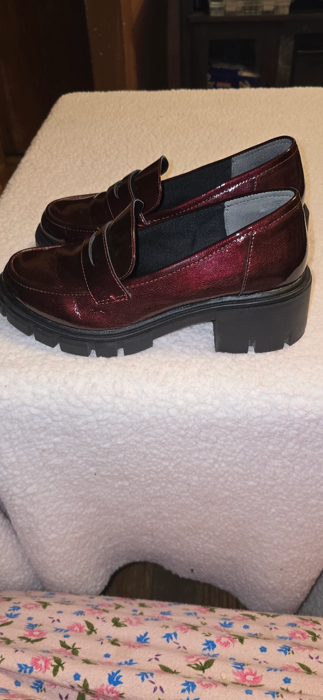 10Women's burgundy patent leather loafers. Size 9M. Chunky sole. Synthetic upper.