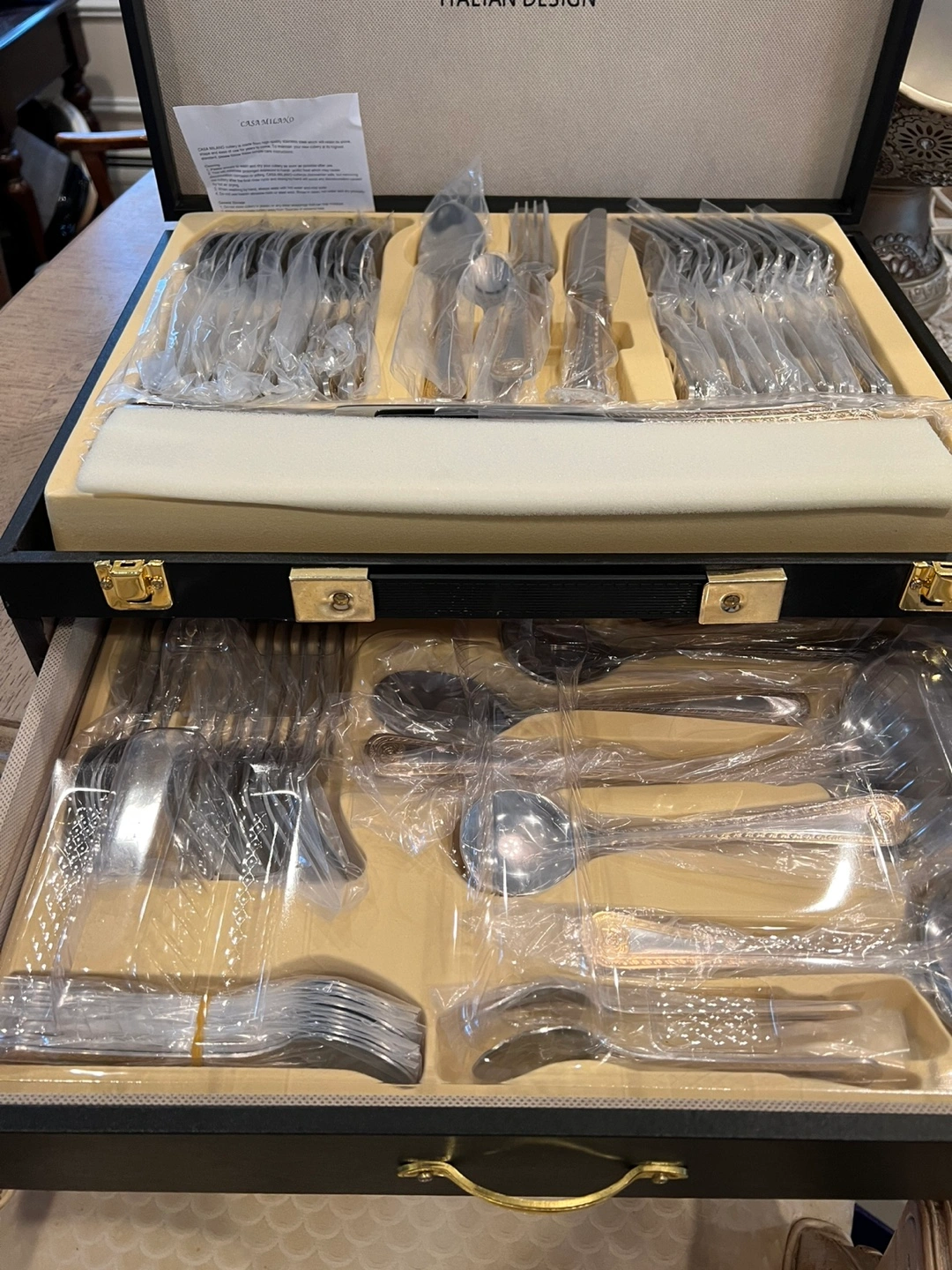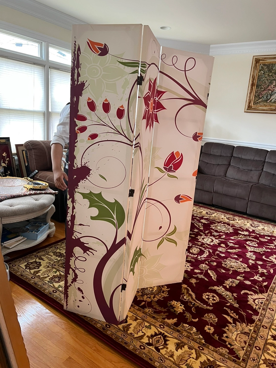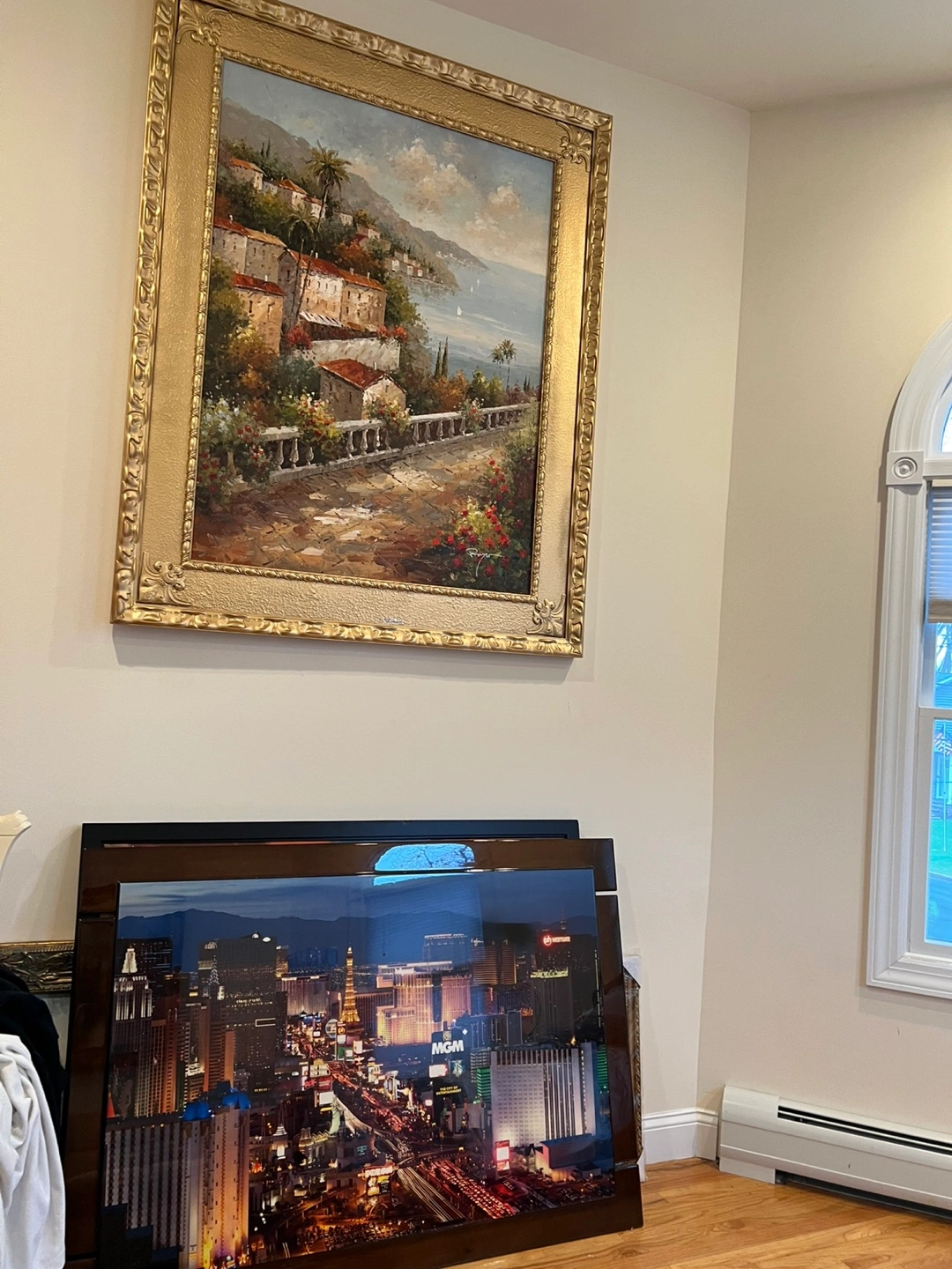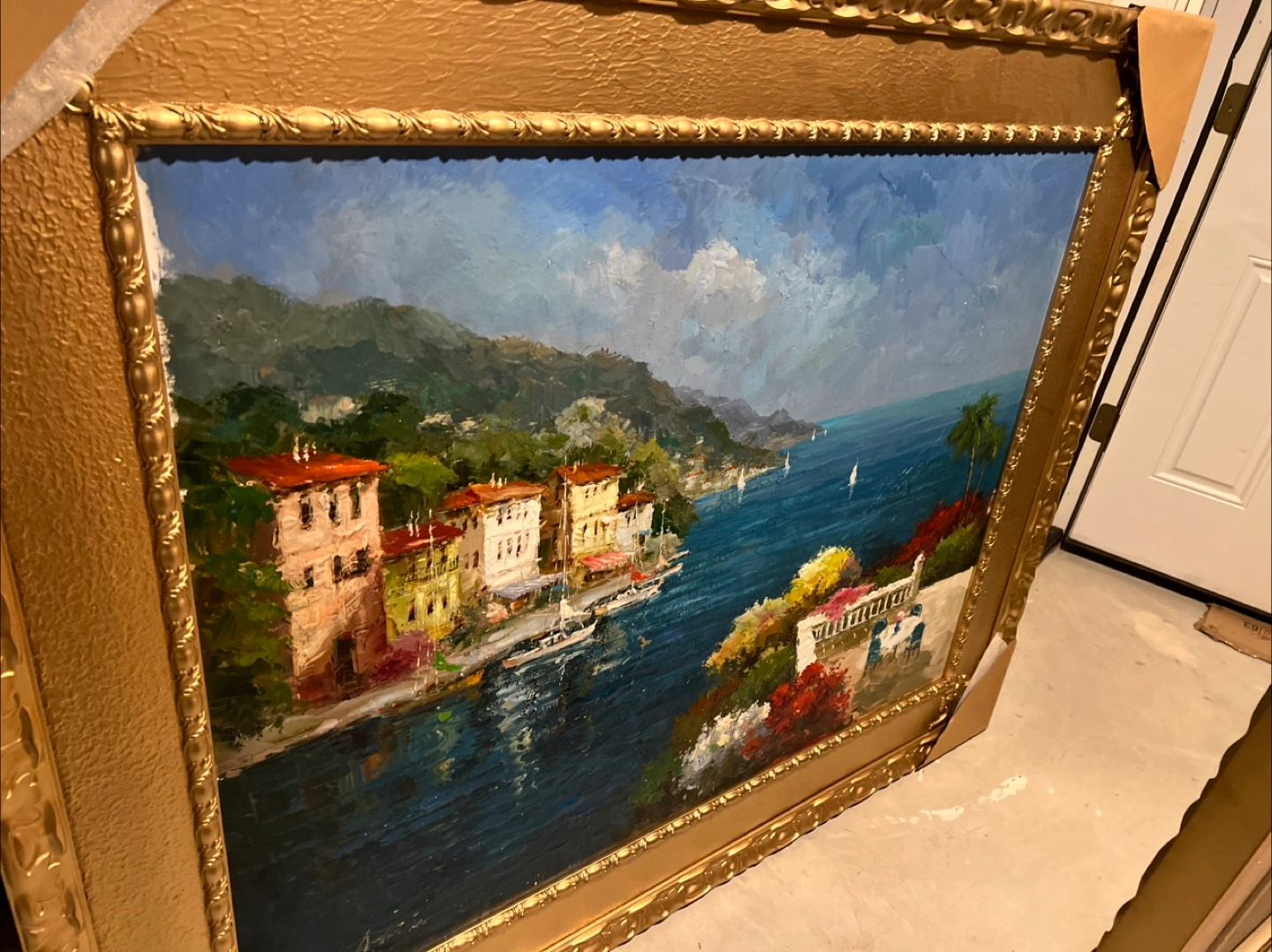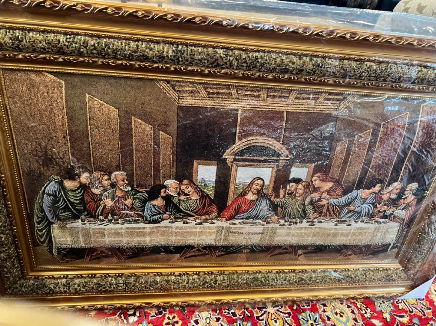 Two large framed pieces of art. One depicts a coastal scene with buildings and boats. Gold ornate frame. The other features The Last Supper. Gold ornate frame. Both in excellent condition.