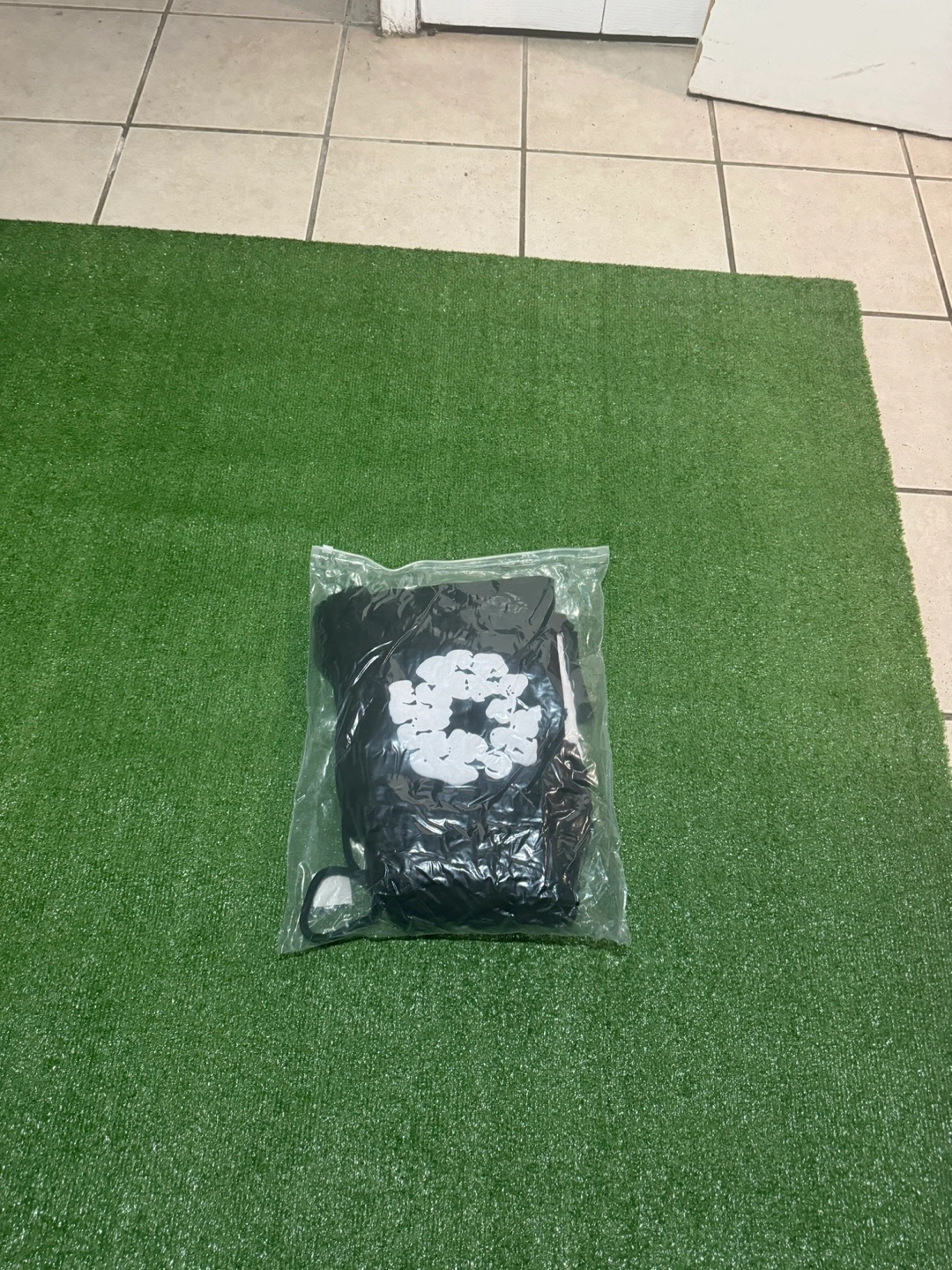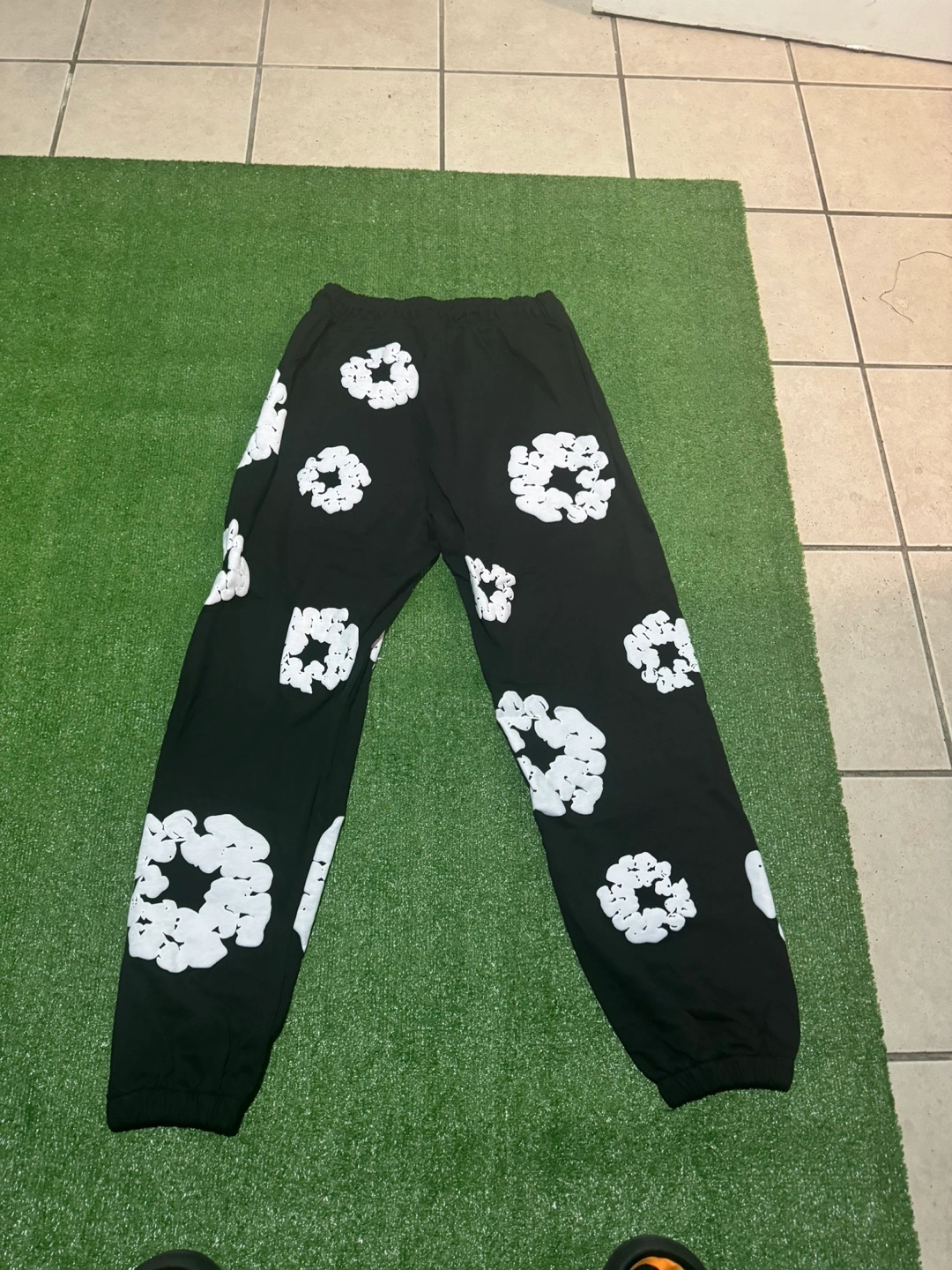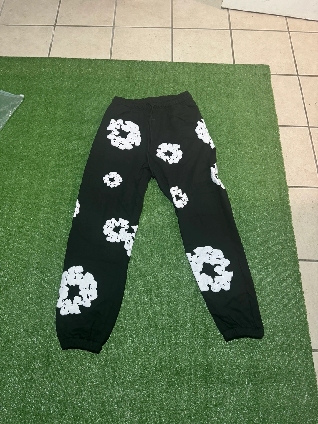 Black nylon trail pants. White graphic print. Elastic waistband with drawstring. Cuffed legs. Great condition.