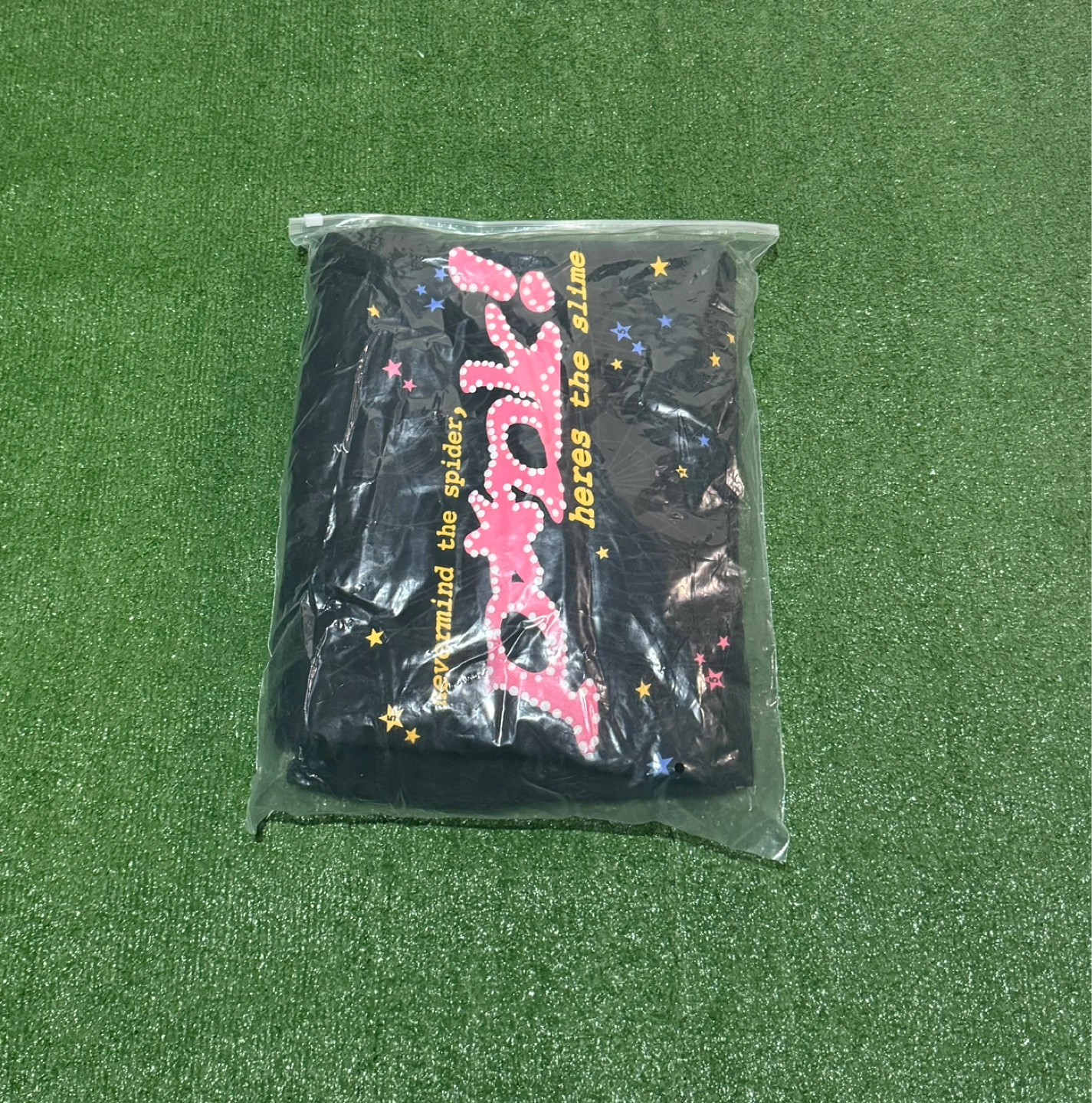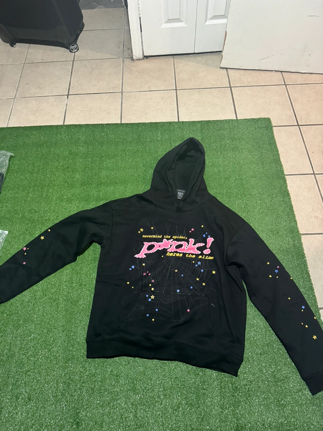 Black hoodie with graphic print. Features a spiderweb and stars. Long sleeves, drawstring hood. Size not specified.
