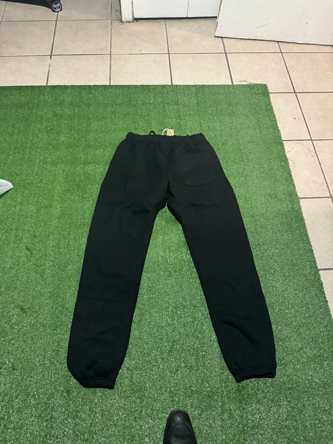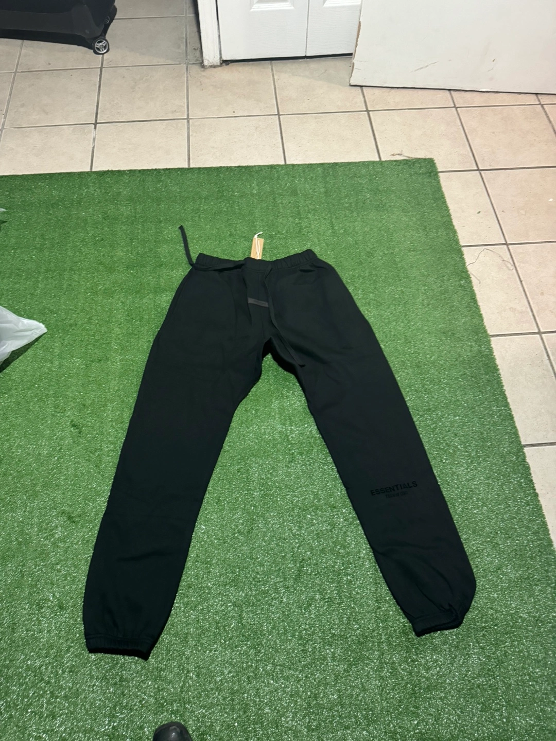 Black sweatpants. Drawstring waist. Cuffed ankles. Small Essentials logo on leg. Excellent condition.