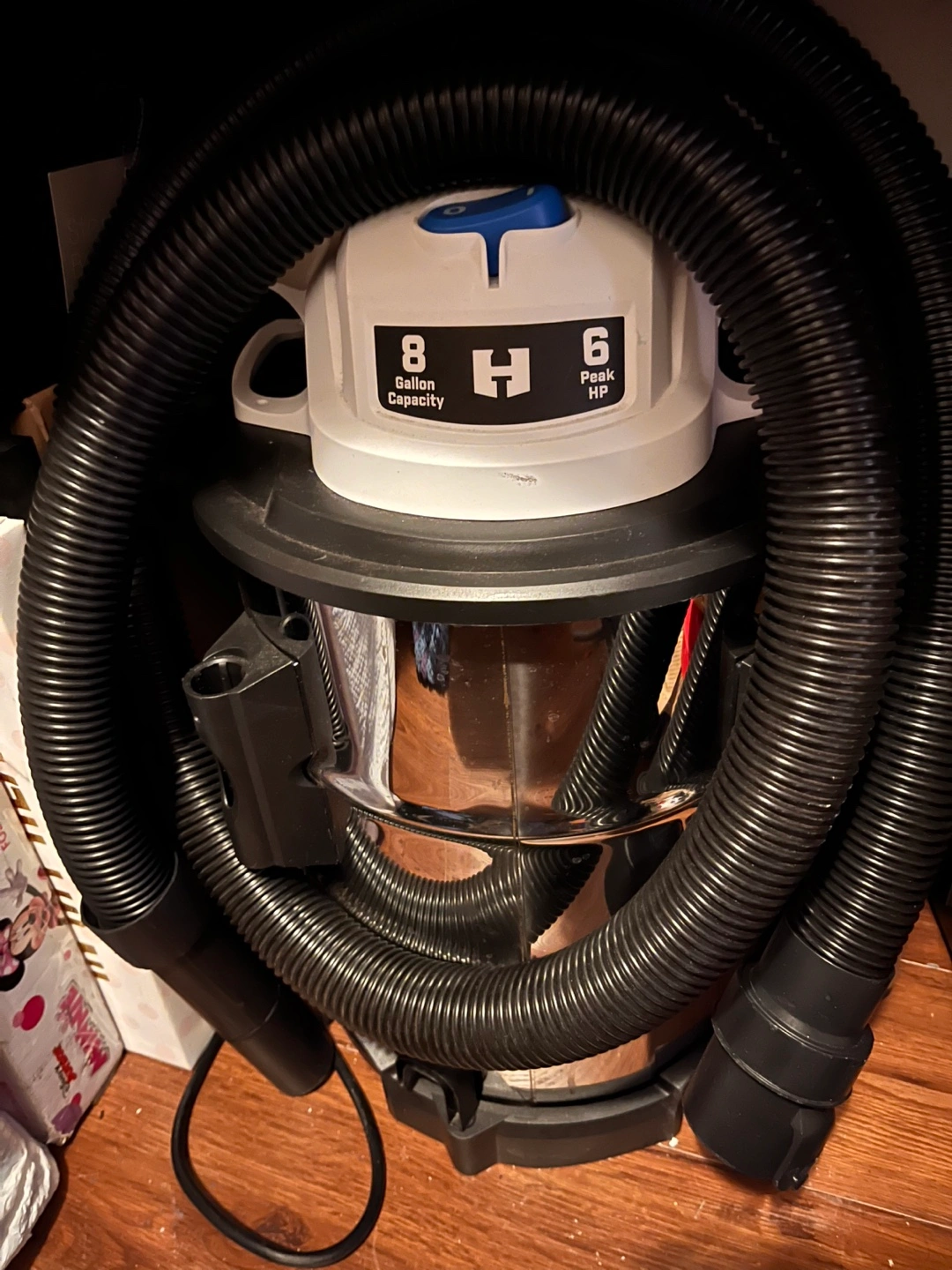 26Shop-Vac wet/dry vac. 8-gallon capacity, 6 peak HP. Includes various attachments and accessories. Great for cleaning garages, workshops, or cars.