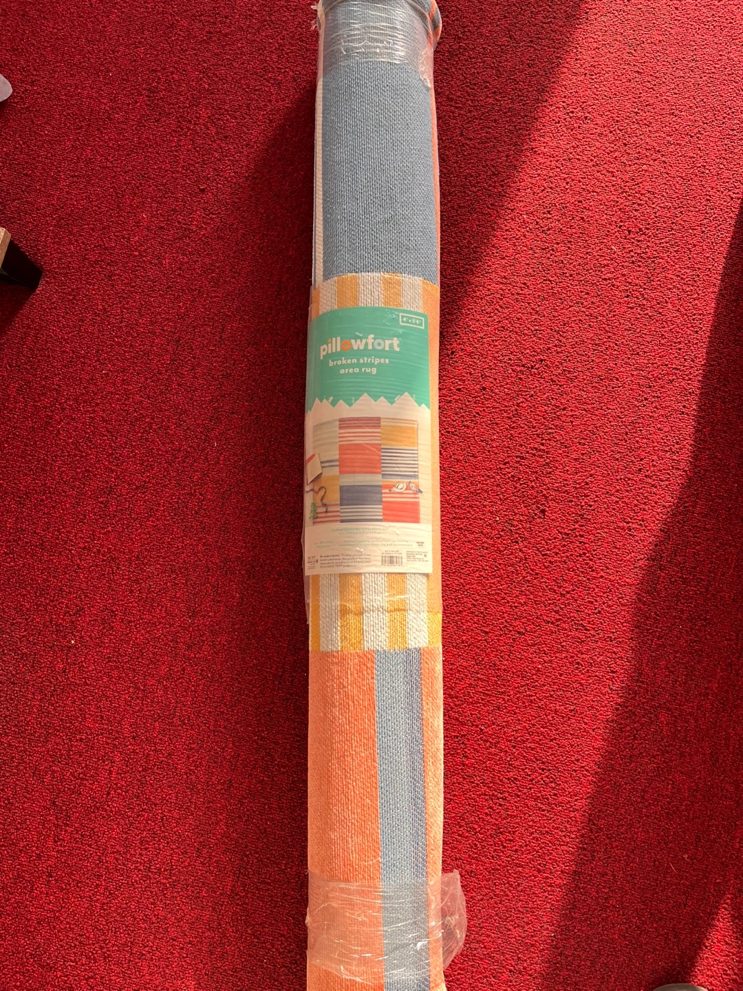 26New Pillowfort area rug. Multicolored stripes. 4ft x 5ft 6in. 84% cotton/16% polyester. Machine washable. Oeko-Tex Standard 100 certified.