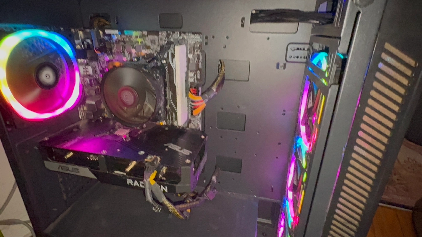 Complete gaming PC setup. Includes tower with RGB fans and lighting, AMD Radeon graphics card, and AOC & ASUS monitors. Apevia 600W power supply. Plays games like Ark and Minecraft, Warzone, Cold War, R6 Siege etc. 350+ FPS